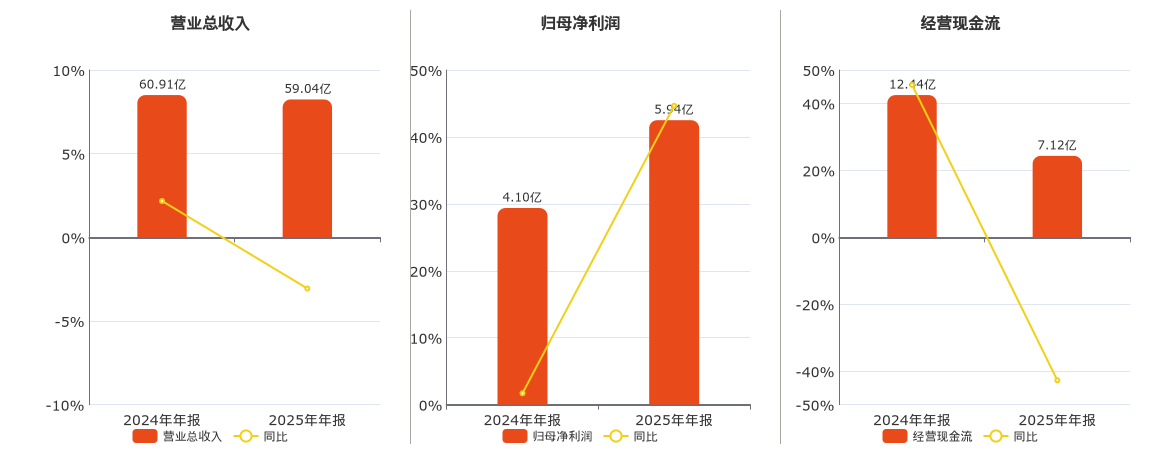 公司营业总收入为59.04亿元。归母净利润为5.94亿元,较去年同报告期归母净利润增加1.83亿元,实现2年连续上涨,同比较去年同期上涨44.66%。经营活动现金净流入为7.12亿元。