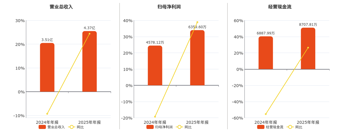 公司营业总收入为4.37亿元,较去年同报告期营业总收入增加8573.59万元,同比较去年同期上涨24.41%。归母净利润为6359.60万元,较去年同报告期归母净利润增加1781.48万元,同比较去年同期上涨38.91%。经营活动现金净流入为8707.81万元,较去年同报告期经营活动现金净流入增加1819.82万元,同比较去年同期上涨26.42%。