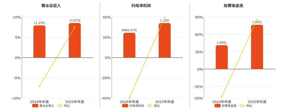 公司营业总收入为12.07亿元,较去年同报告期营业总收入增加8350.49万元,同比较去年同期上涨7.43%。归母净利润为1.19亿元,较去年同报告期归母净利润增加3375.68万元,同比较去年同期上涨39.43%。经营活动现金净流入为1.93亿元,较去年同报告期经营活动现金净流入增加8885.46万元,同比较去年同期上涨85.50%。