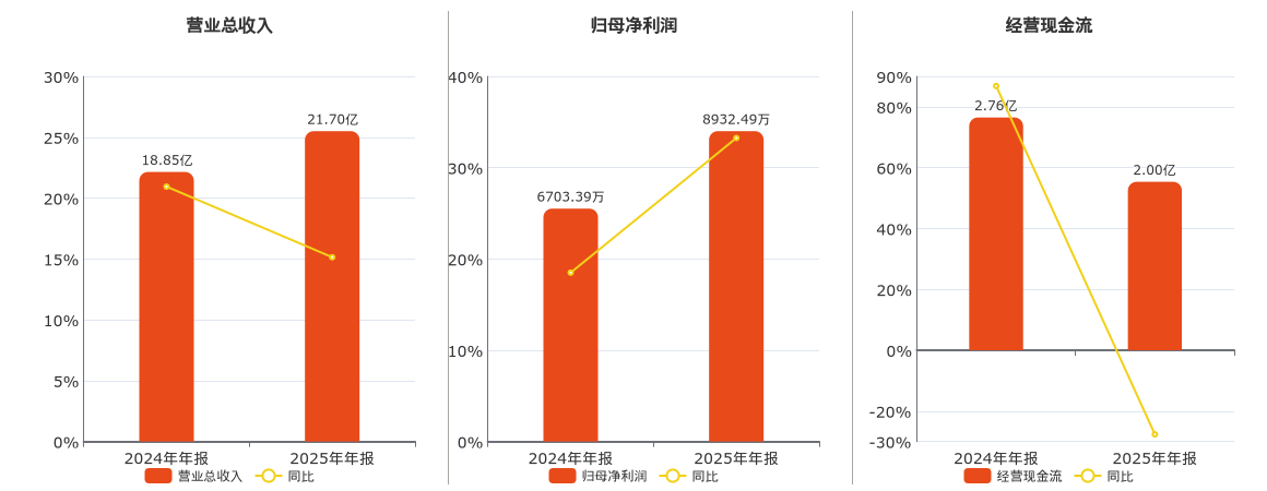 公司营业总收入为21.70亿元,较去年同报告期营业总收入增加2.85亿元,实现5年连续上涨,同比较去年同期上涨15.14%。归母净利润为8932.49万元,较去年同报告期归母净利润增加2229.11万元,实现3年连续上涨,同比较去年同期上涨33.25%。经营活动现金净流入为2.00亿元。