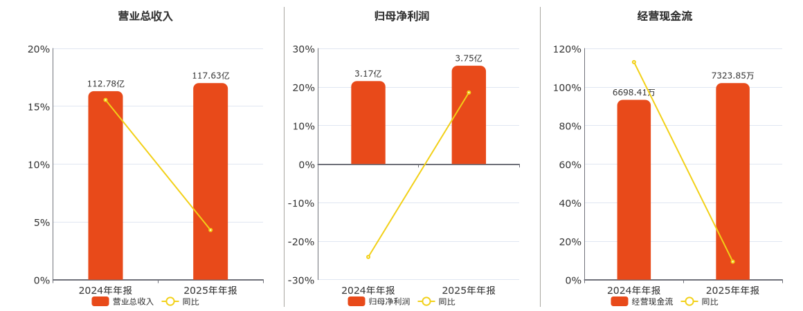 公司营业总收入为117.63亿元,较去年同报告期营业总收入增加4.84亿元,实现2年连续上涨,同比较去年同期上涨4.29%。归母净利润为3.75亿元,较去年同报告期归母净利润增加5876.22万元,同比较去年同期上涨18.55%。经营活动现金净流入为7323.85万元,较去年同报告期经营活动现金净流入增加625.45万元,实现2年连续上涨,同比较去年同期上涨9.34%。