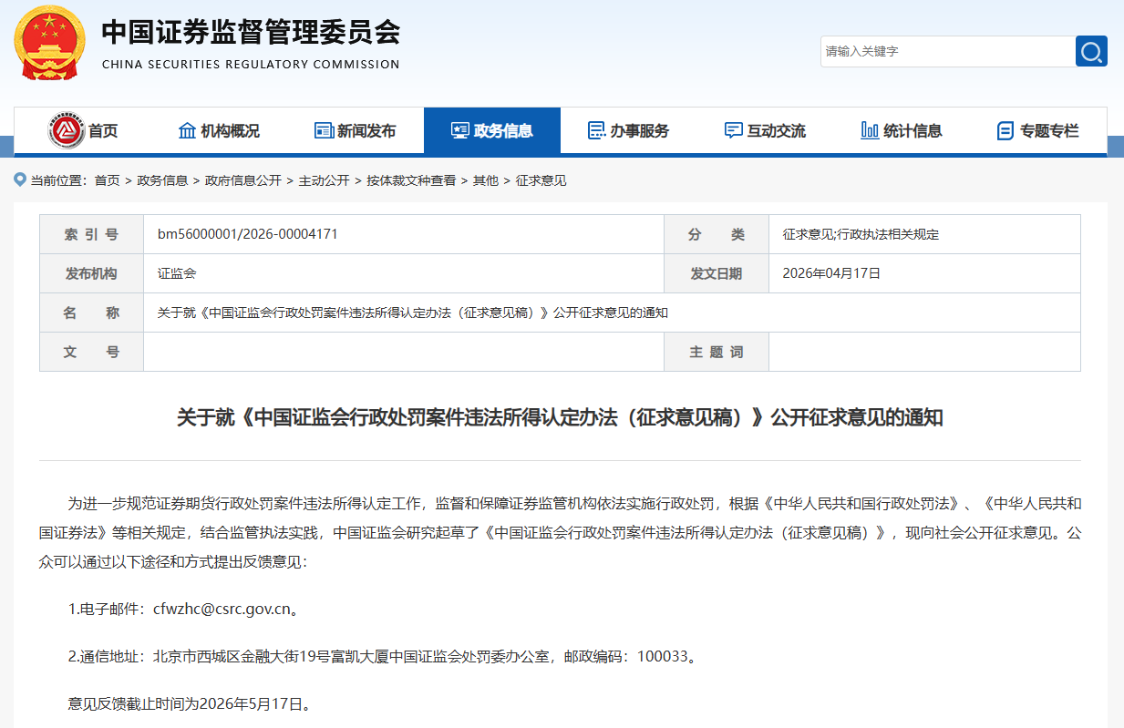 证监会就《行政处罚案件违法所得认定办法》公开征求意见