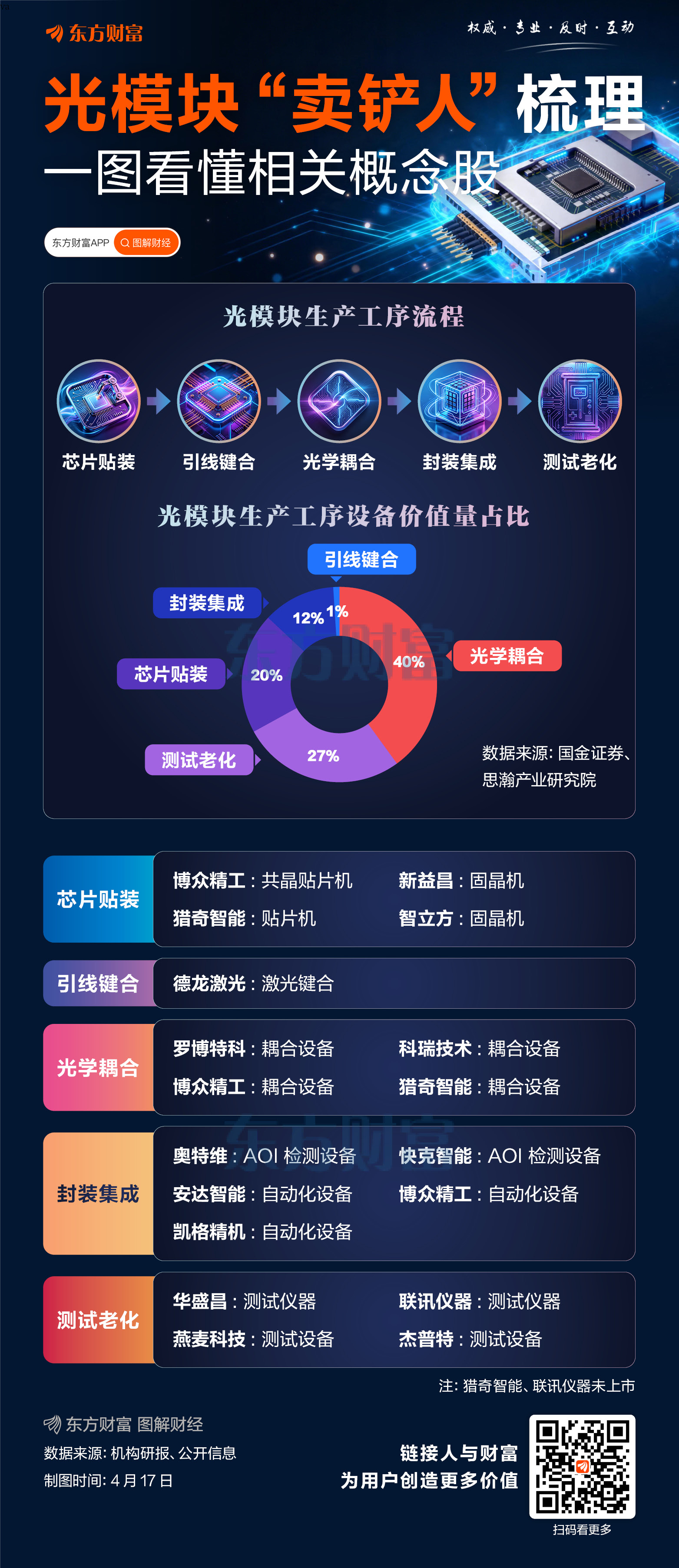 据国金证券研报,思瀚产业研究院数据显示,光模块生产过程包括芯片贴装、引线键合、光学耦合、封装集成、测试老化,各环节对应设备价值量分别占比为 20%、1%、40%、12%、27%。其中光学耦合、测试为价值占比最大的两个环节。