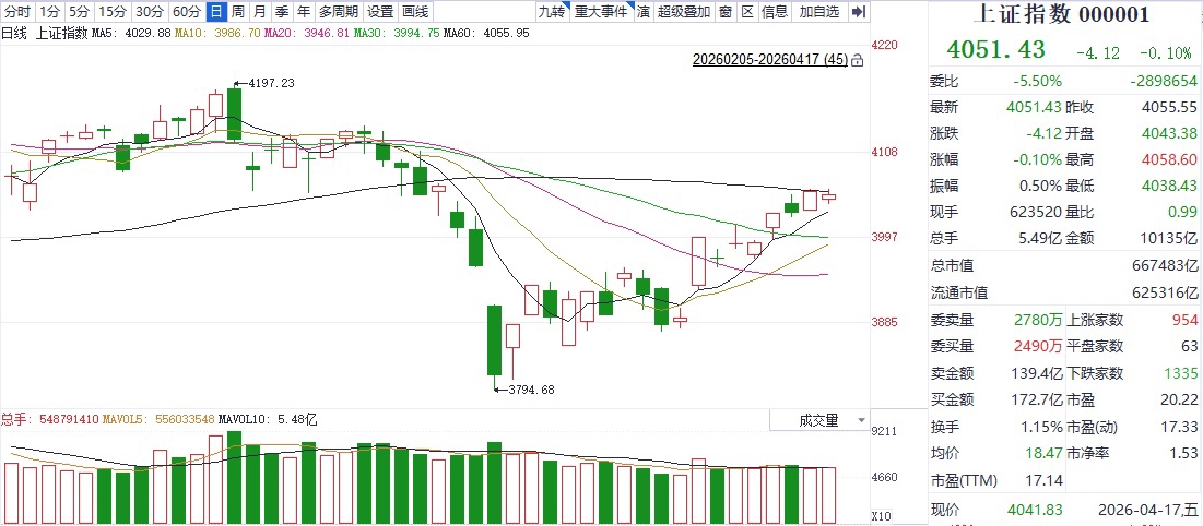 截至收盘,上证指数报收4051.43点,下跌0.1%;深证成指报收14885.42点,上涨0.6%;创业板指报收3678.29点,上涨1.43%。沪深北三市成交额达到24531亿元,较前一交易日放大980亿元。