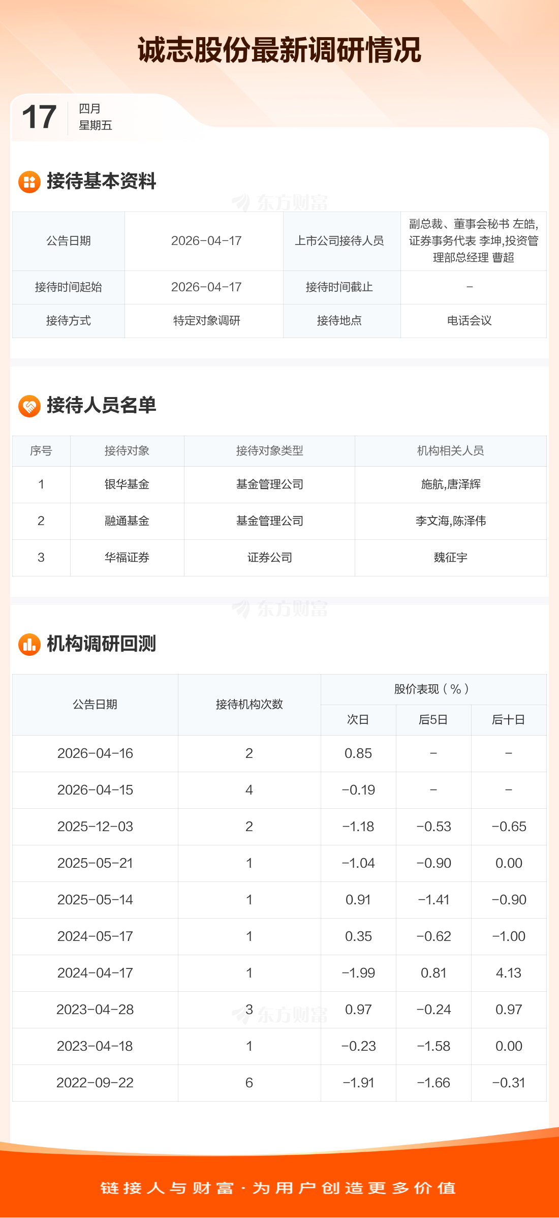 诚志股份4月17日公告称,4月17日接待银华基金等3家机构调研。接待人员包括副总裁、董事会秘书 左皓,证券事务代表 李坤,投资管理部总经理 曹超。