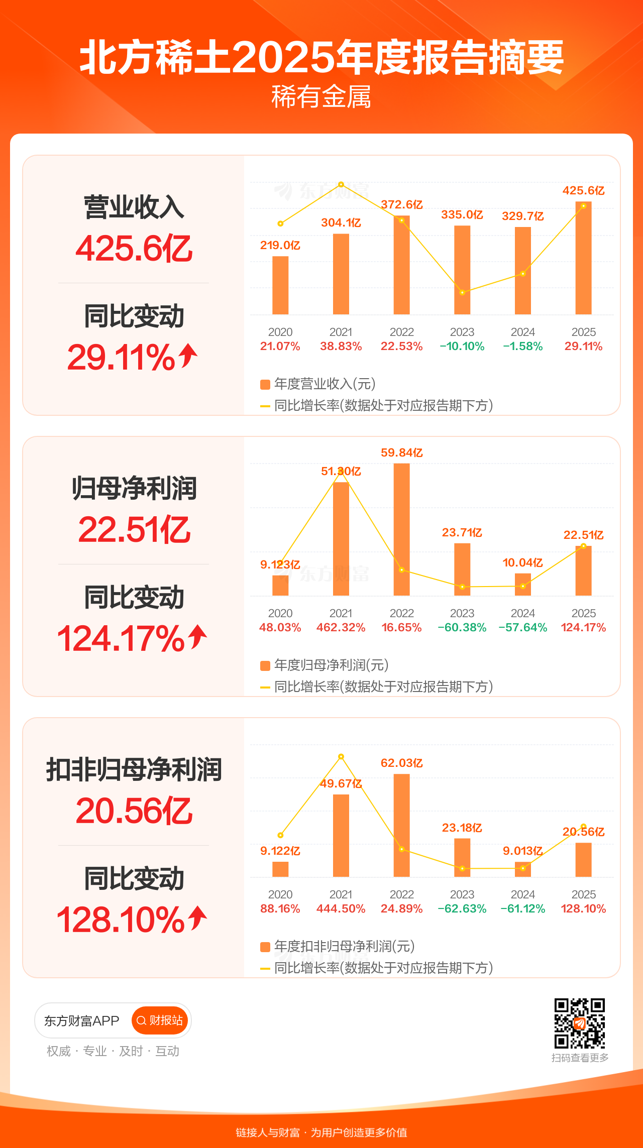 北方稀土4月18日发布2025年年报显示,公司全年实现营业收入425.63亿元,同比增长29.11%;归母净利润22.51亿元,同比增长124.17%;扣非归母净利润20.56亿元,同比增长128.10%。