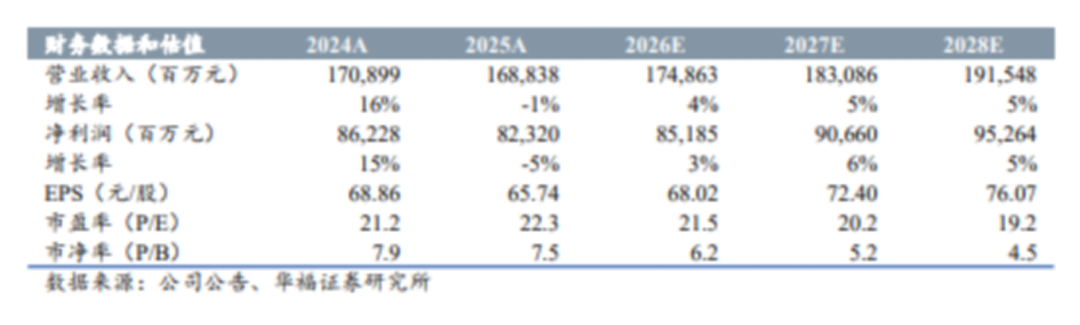 华福证券于4月16日、17日发布了2篇关于贵州茅台的研报。4月16日研报《品牌优势充分显现,市场化改革打开新局面》给出的预测显示,预计公司2025至2027年归母净利润分别为904.71亿元、946.22亿元及996.57亿元,同比增速分别为4.92%、4.59%、5.32%,且预测2025年营收同比增幅或达到5%。然而,公司发布年报后,也就是在4月17日盘后,华福证券再发研报《韧性犹在,勇拓新篇》,又下调了2025年、2026年的预测目标。
