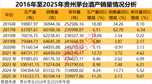 在业内看来,贵州茅台2025年营收及净利润的下降,打破了茅台长期稳健增长的态势,或成为白酒行业深度调整的标志性信号。尽管在年报中,公司披露的数据显示,贵州茅台尽管生产量及销售量较上一年均有增加,但库存量却逐年递增。2023年至2025年库存量比上年分别增加6.21%、5.52%、9.67%,其中2025年库存量34万吨,创近10年新高,增幅同样创下近10年新高。