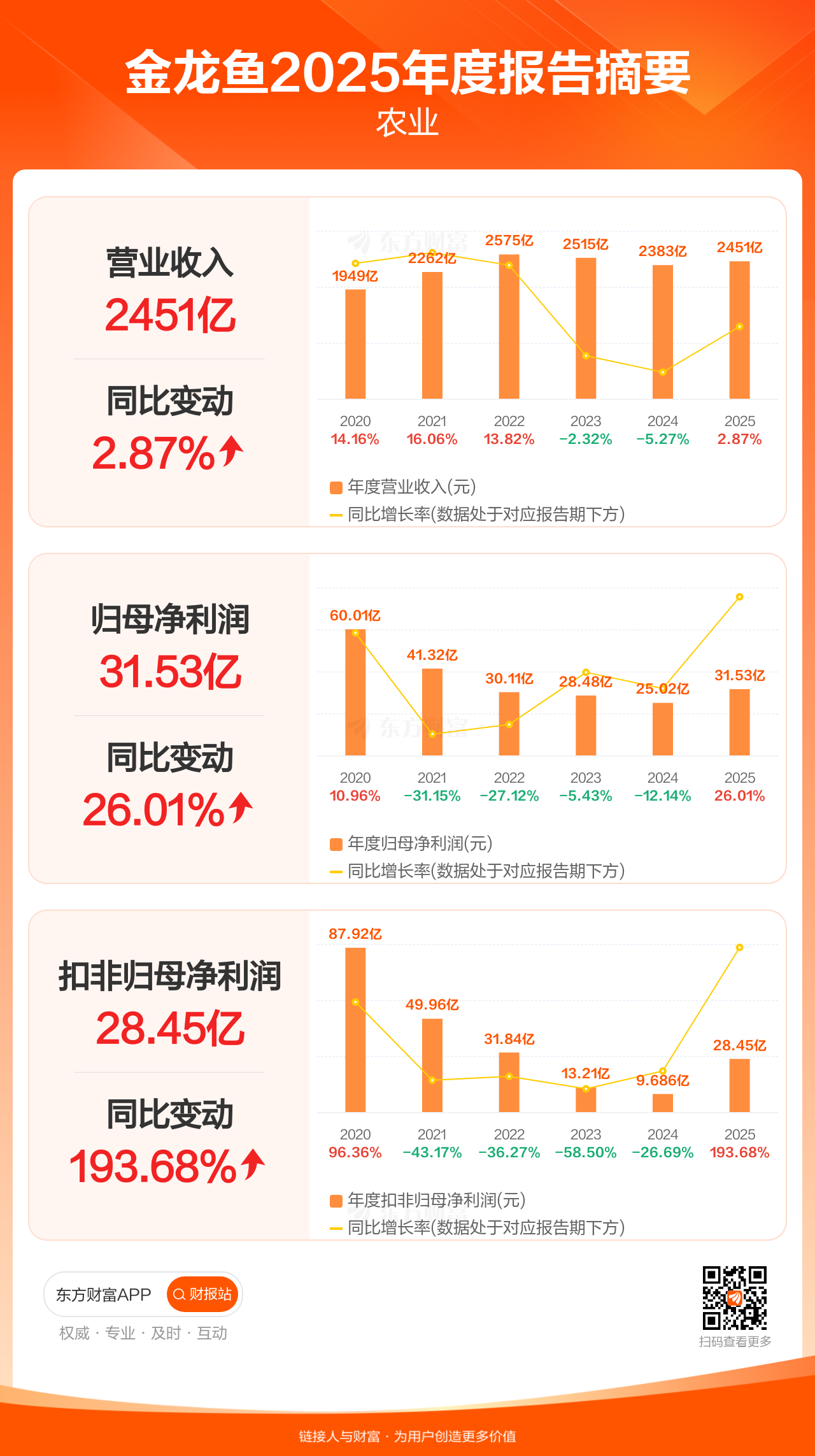 金龙鱼4月18日发布2025年年报显示,公司全年实现营业收入2451.26亿元,同比增长2.87%;归母净利润31.53亿元,同比增长26.01%;扣非归母净利润28.45亿元,同比增长193.68%。