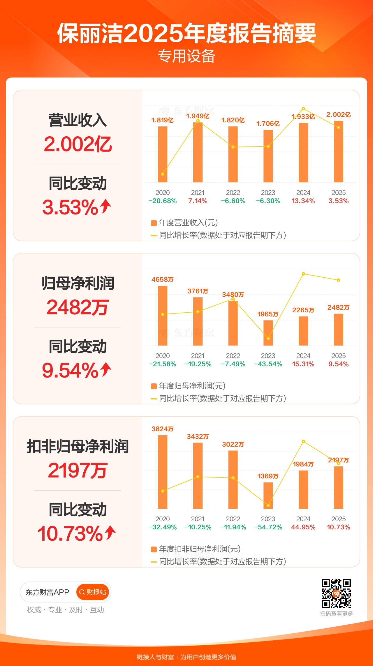 保丽洁4月17日发布2025年年报显示,公司全年实现营业收入2.00亿元,同比增长3.53%;归母净利润2481.58万元,同比增长9.54%;扣非归母净利润2196.63万元,同比增长10.73%。