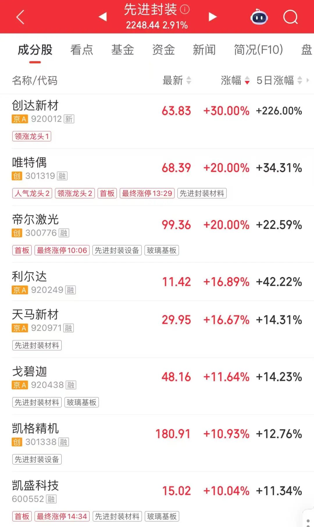 此外,半导体产业链上,先进封装、光刻机板块涨幅居前,唯特偶、帝尔激光“20CM”涨停。