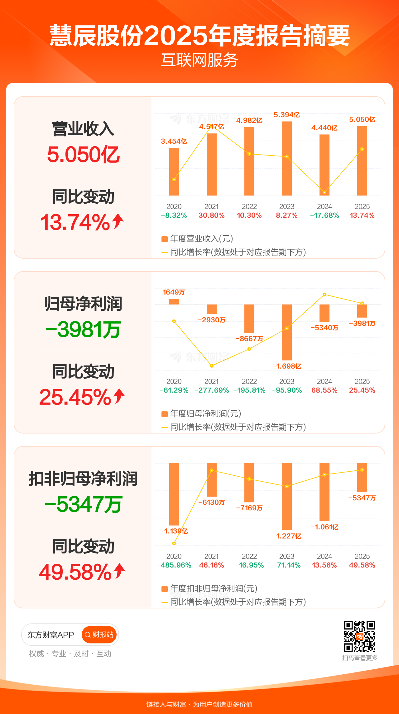 慧辰股份4月18日发布2025年年报显示,公司全年实现营业收入5.05亿元,同比增长13.74%;归母净利润-3980.56万元;扣非归母净利润-5347.17万元。