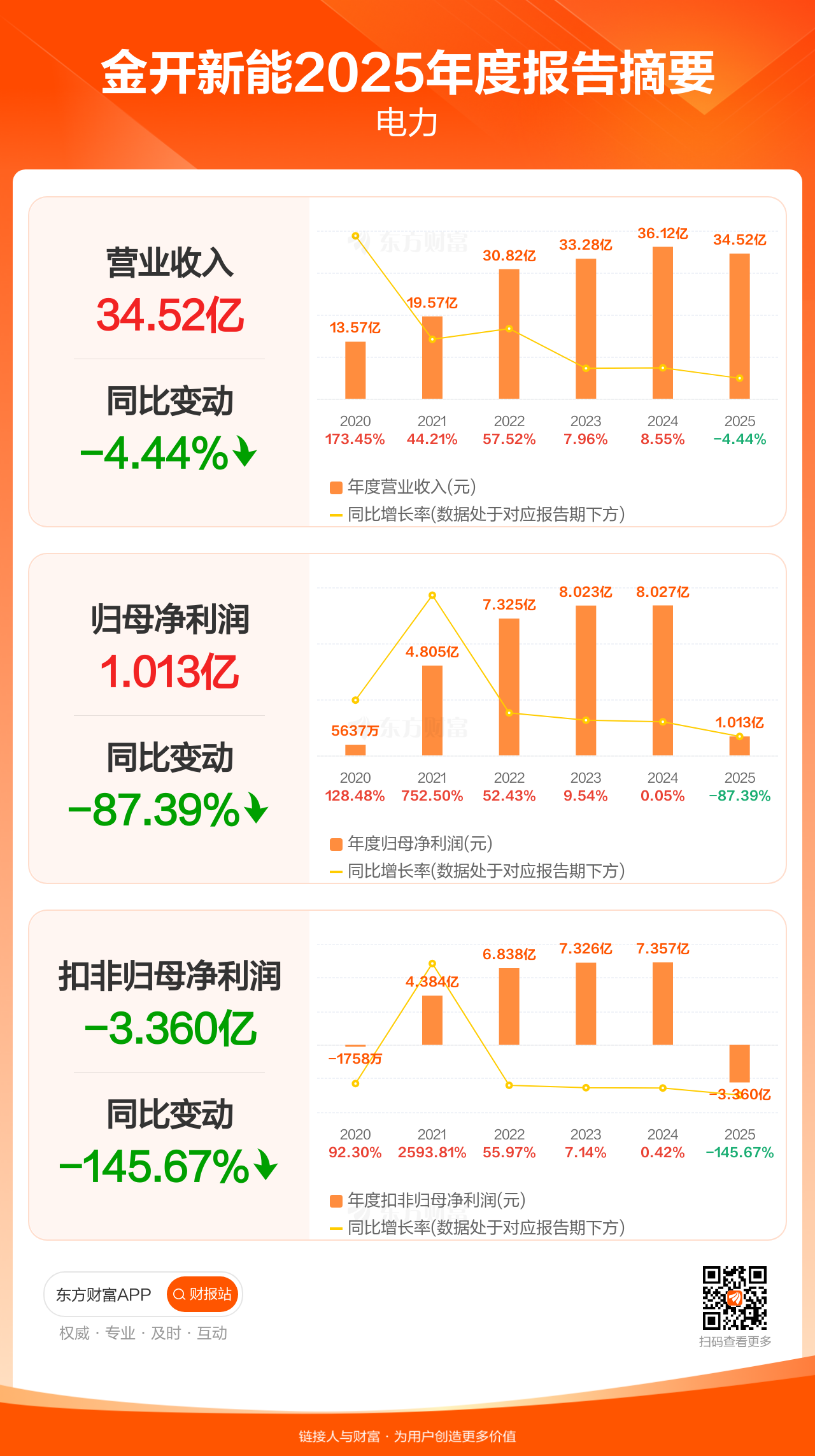金开新能4月18日发布2025年年报显示,公司全年实现营业收入34.52亿元,同比下滑4.44%;归母净利润1.01亿元,同比下滑87.39%;扣非归母净利润-3.36亿元。