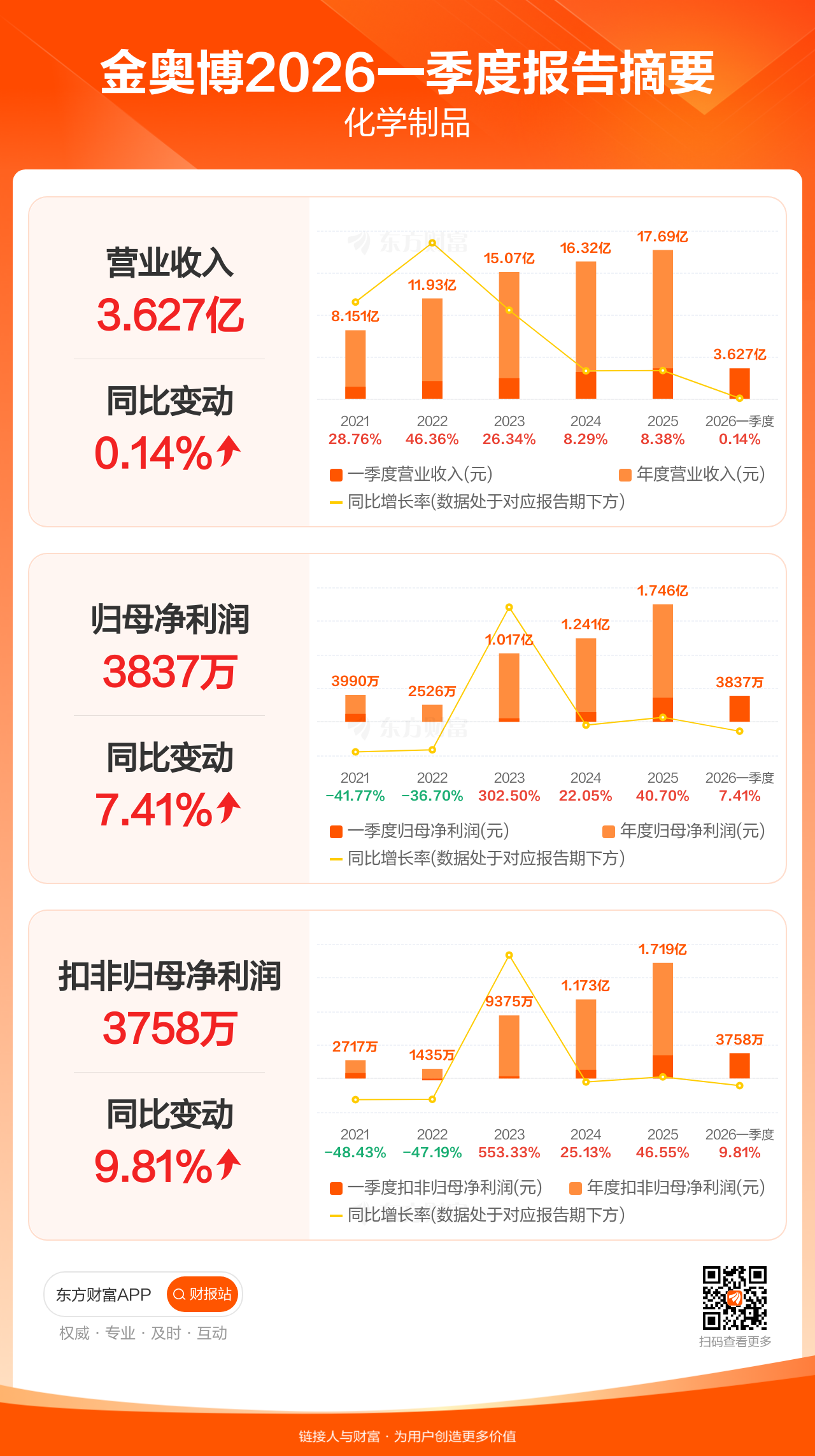 金奥博4月18日发布2026年一季报显示,公司一季度实现营业收入3.63亿元,同比增长0.14%;归母净利润3836.73万元,同比增长7.41%;扣非归母净利润3757.97万元,同比增长9.81%。