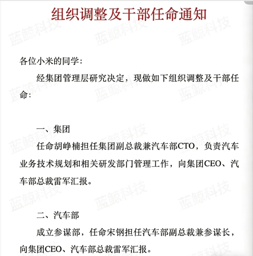 蓝鲸科技记者获悉,今日小米集团发布内部邮件宣布两项重要人事任命:胡峥楠出任小米集团副总裁、汽车部 CTO;宋钢出任小米集团汽车部副总裁、参谋长。
