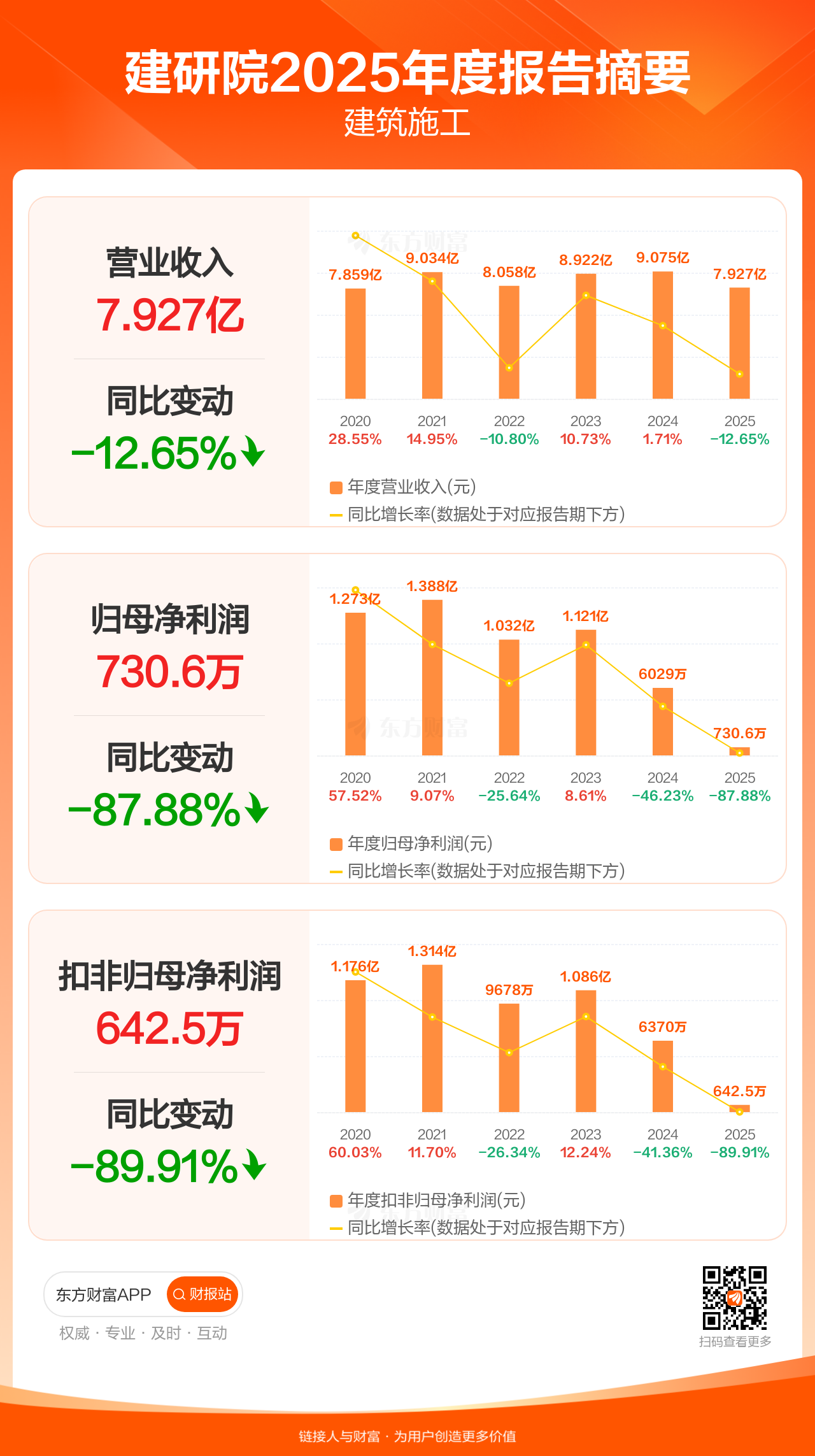 建研院4月18日发布2025年年报显示,公司全年实现营业收入7.93亿元,同比下滑12.65%;归母净利润730.60万元,同比下滑87.88%;扣非归母净利润642.50万元,同比下滑89.91%。