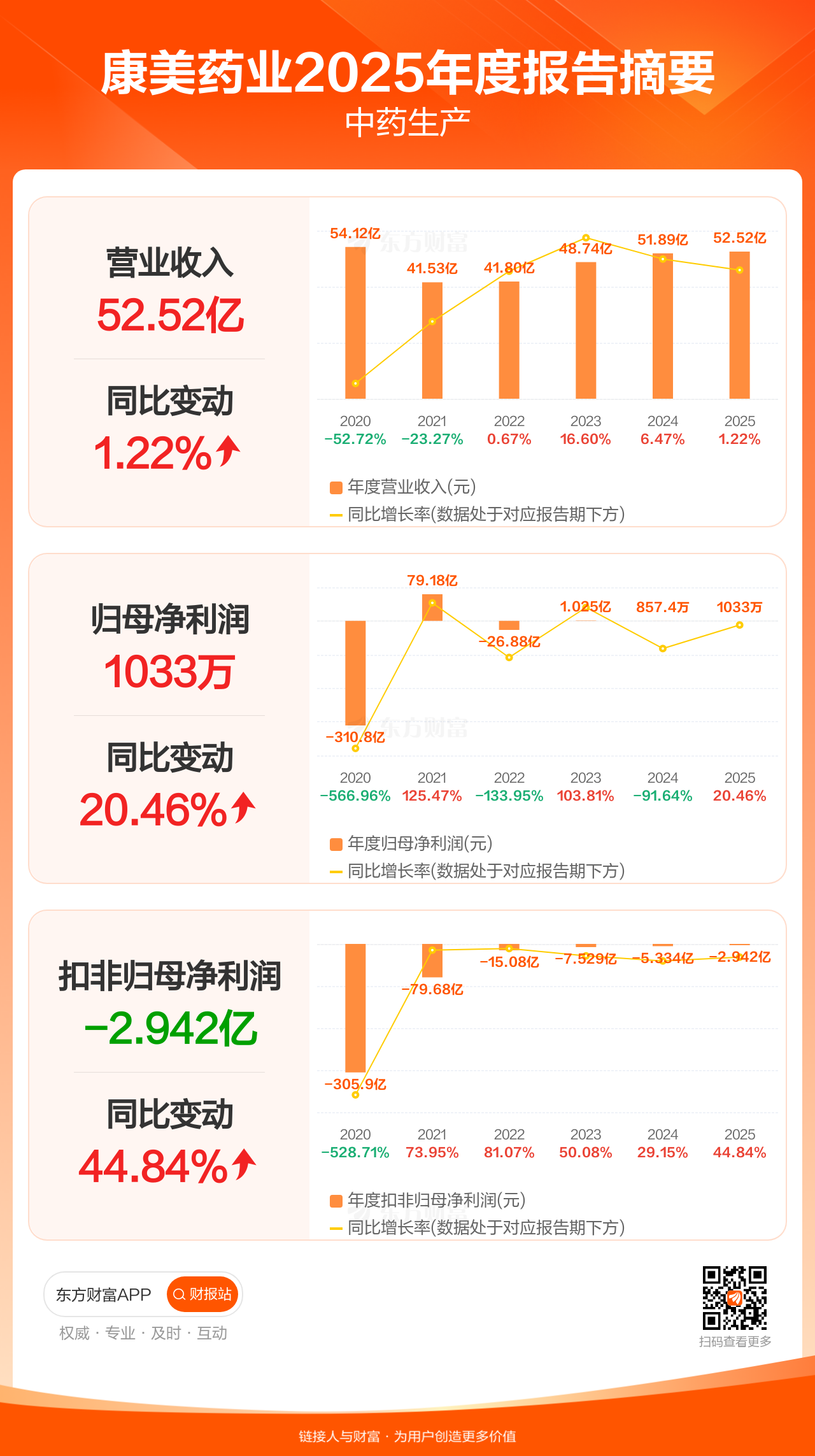 康美药业4月18日发布2025年年报显示,公司全年实现营业收入52.52亿元,同比增长1.22%;归母净利润1032.80万元,同比增长20.46%;扣非归母净利润-2.94亿元。