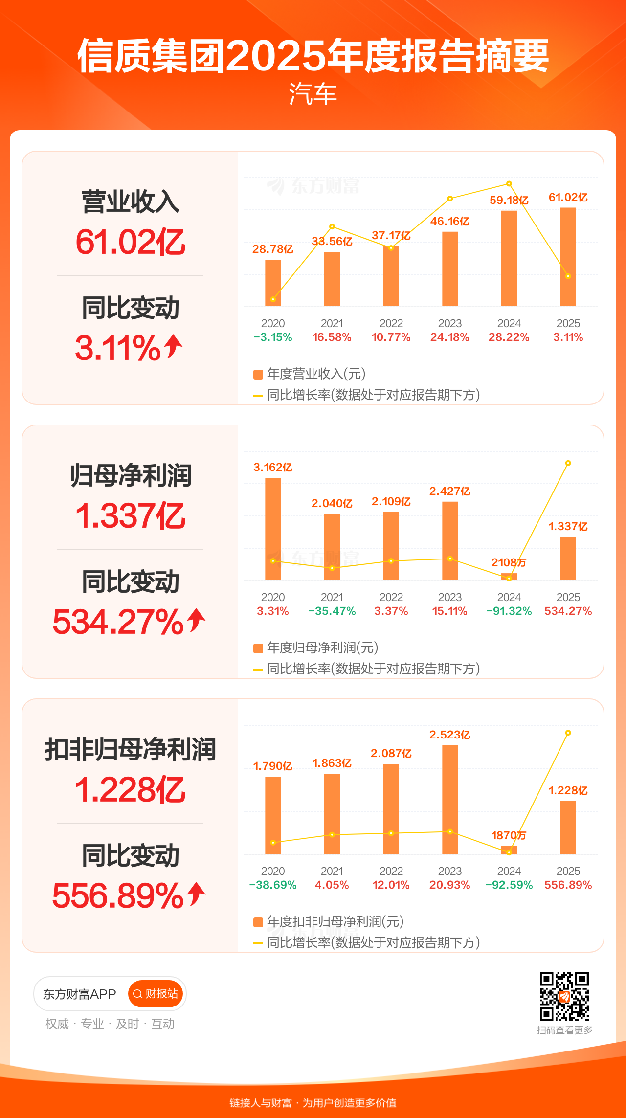 信质集团4月18日发布2025年年报显示,公司全年实现营业收入61.02亿元,同比增长3.11%;归母净利润1.34亿元,同比增长534.27%;扣非归母净利润1.23亿元,同比增长556.89%。