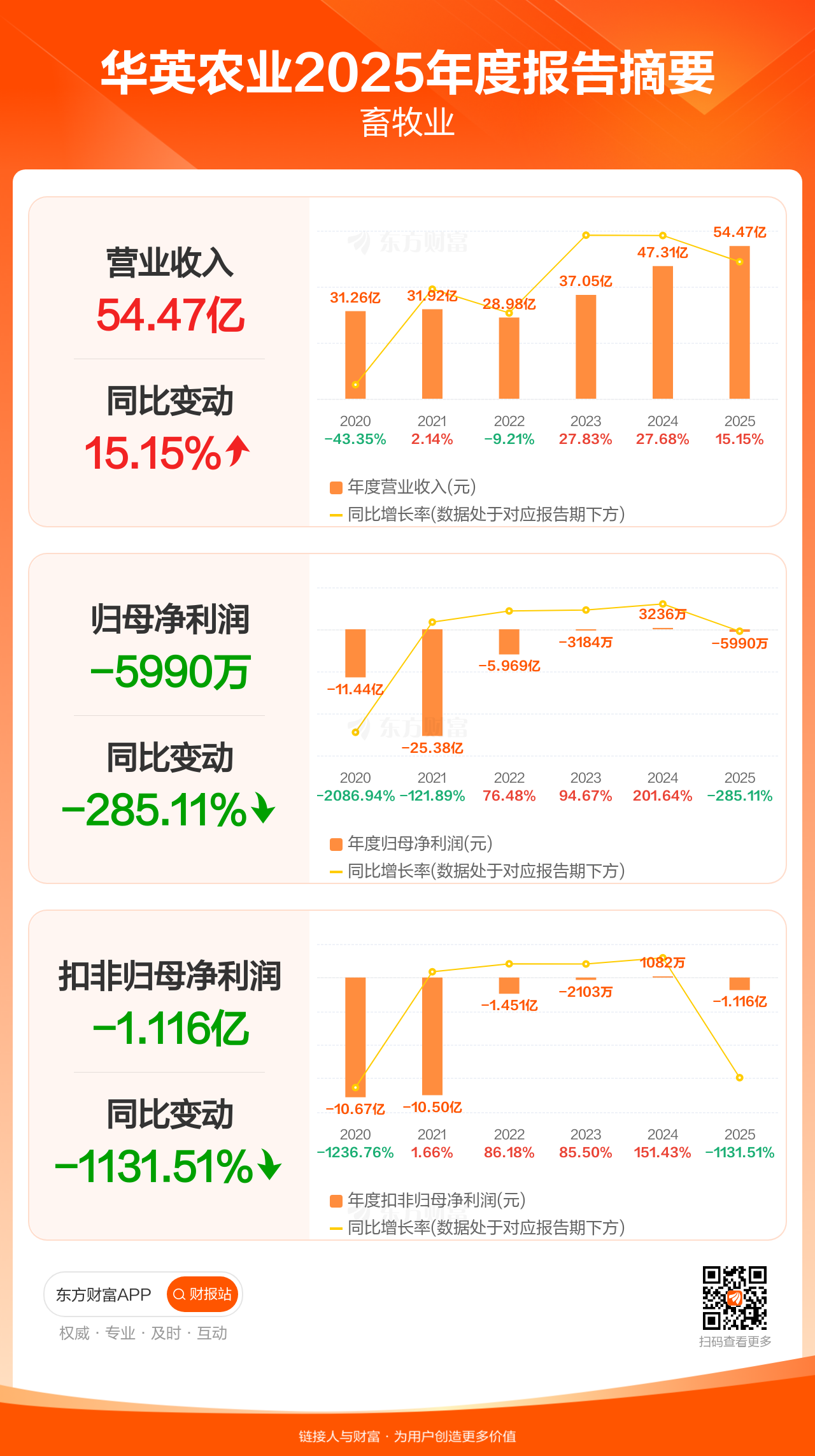 华英农业4月18日发布2025年年报显示,公司全年实现营业收入54.47亿元,同比增长15.15%;归母净利润-5990.38万元;扣非归母净利润-1.12亿元。