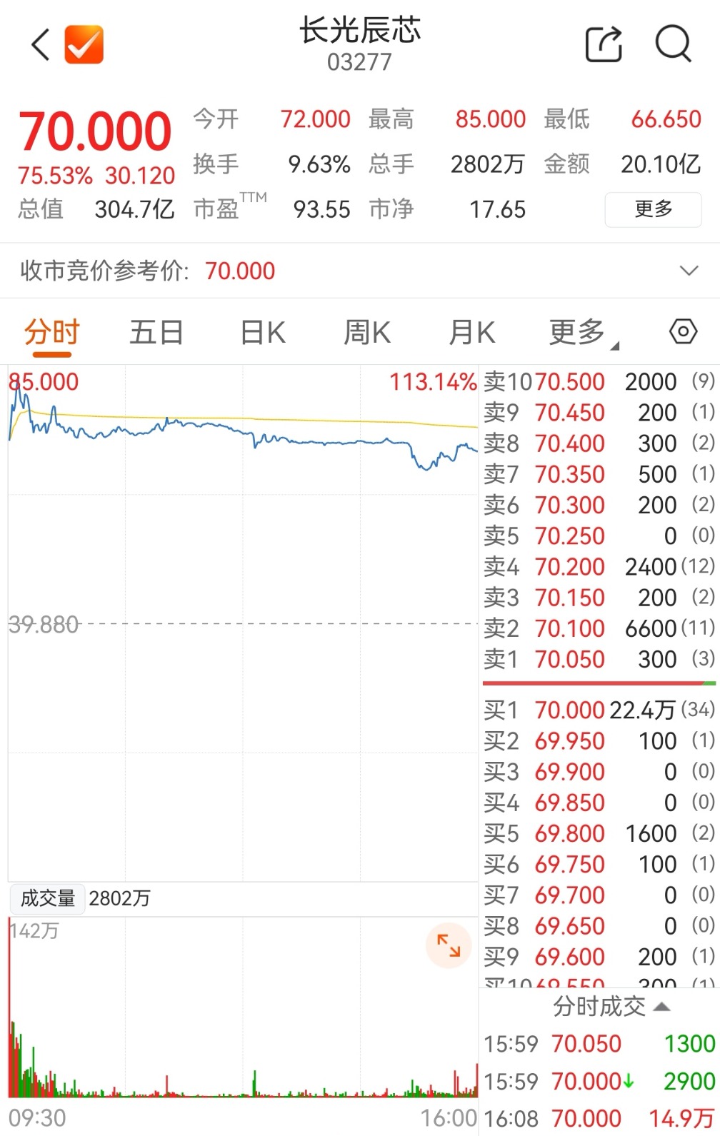 上证报中国证券网讯(记者田甜)长春长光辰芯微电子股份有限公司4月17日在香港联交所主板正式挂牌上市,成为国内高端CMOS图像传感器领域首家登陆港股的企业。截至当日收盘,长光辰芯报70港元/股,较39.88港元/股的发行价上涨75.53%,成交额达20.1亿港元,总市值约304.7亿港元。公司本次全球发售6529.42万股H股,募集资金总额约26亿港元。