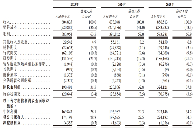 招股书显示,2023年至2025年,长光辰芯营收分别实现6.05亿元、6.73亿元和8.57亿元;同期净利润从1.70亿元、1.97亿元增长至2.93亿元,净利率由28.1%、29.3%提升至34.2%,盈利能力持续改善,经营质量稳步提升。