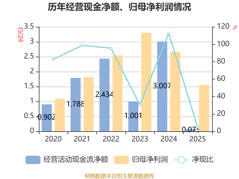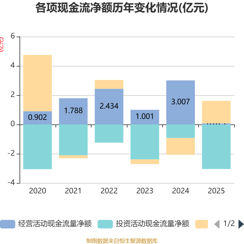 截至2025年,公司经营活动现金流净额为746.48万元,同比下降97.52%;筹资活动现金流净额1.53亿元,同比增加2.69亿元;投资活动现金流净额-3.04亿元,上年同期为-9237.08万元。