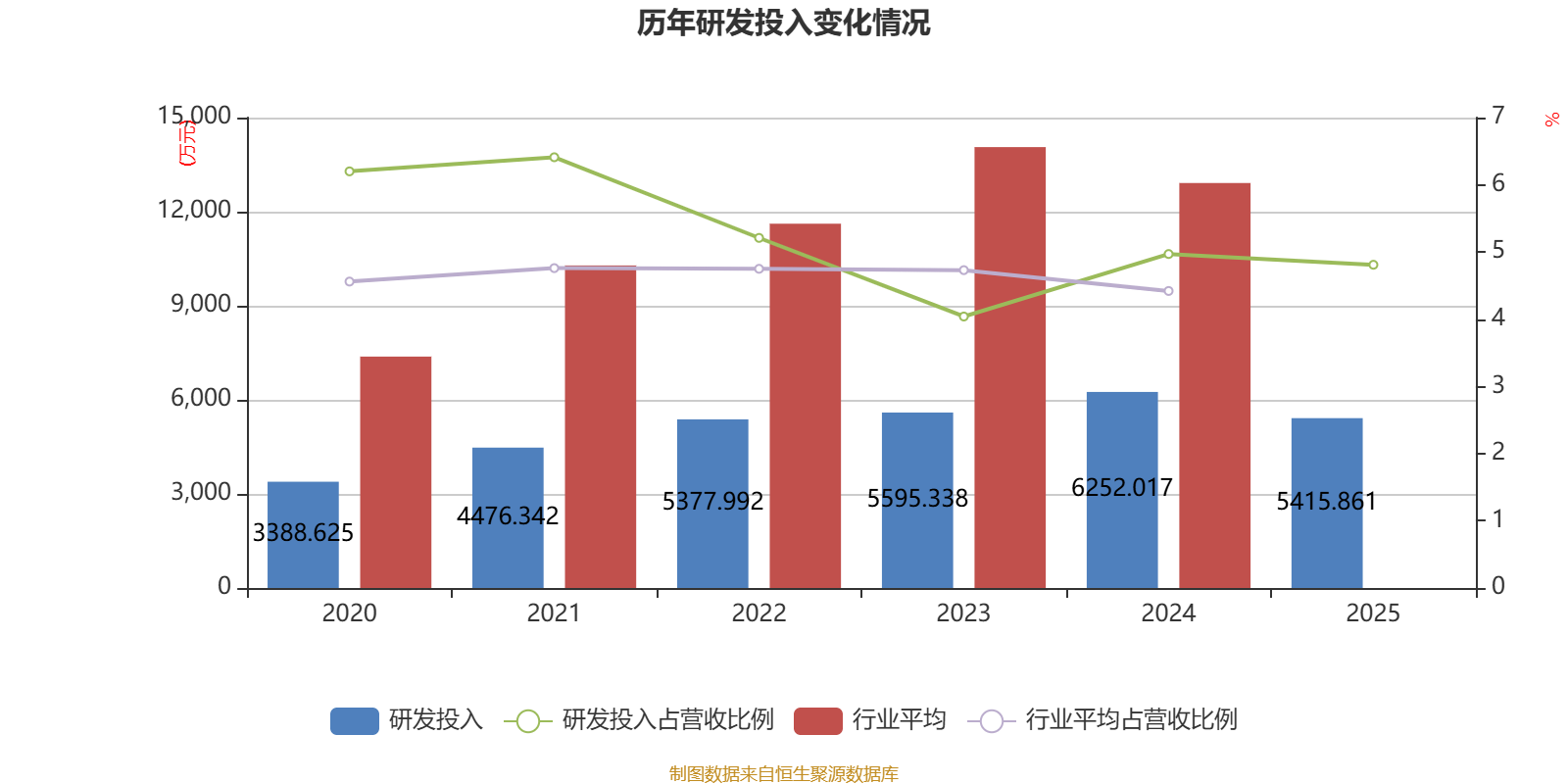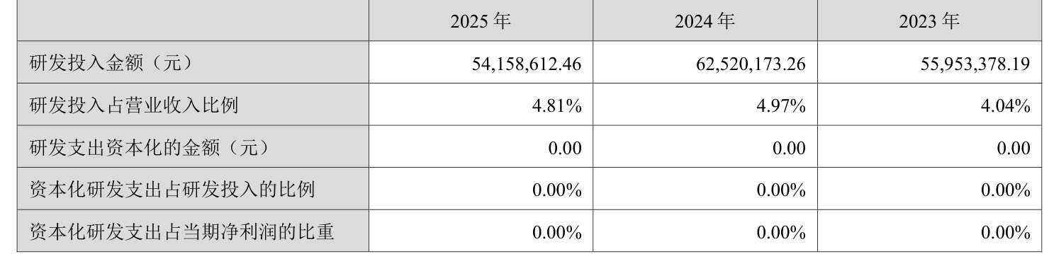 2025年全年,公司研发投入金额为5415.86万元,同比下降13.37%;研发投入占营业收入比例为4.81%,相比上年同期下降0.16个百分点。此外,公司全年研发投入资本化率为0%。