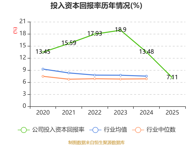 数据显示,2025年公司加权平均净资产收益率为7.82%,较上年同期下降6.31个百分点。公司2025年投入资本回报率为7.11%,较上年同期下降6.37个百分点。