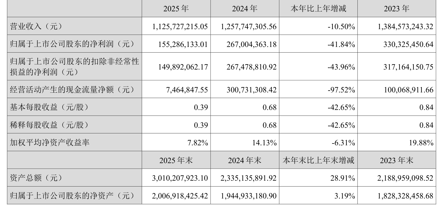 中证智能财讯图南股份(300855)4月18日披露2025年年度报告。2025年,公司实现营业总收入11.26亿元,同比下降10.50%;归母净利润1.55亿元,同比下降41.84%;扣非净利润1.5亿元,同比下降43.96%;经营活动产生的现金流量净额为746.48万元,同比下降97.52%;报告期内,图南股份基本每股收益为0.39元,加权平均净资产收益率为7.82%。公司2025年度分配预案为:拟向全体股东每10股派现1.5元(含税)。