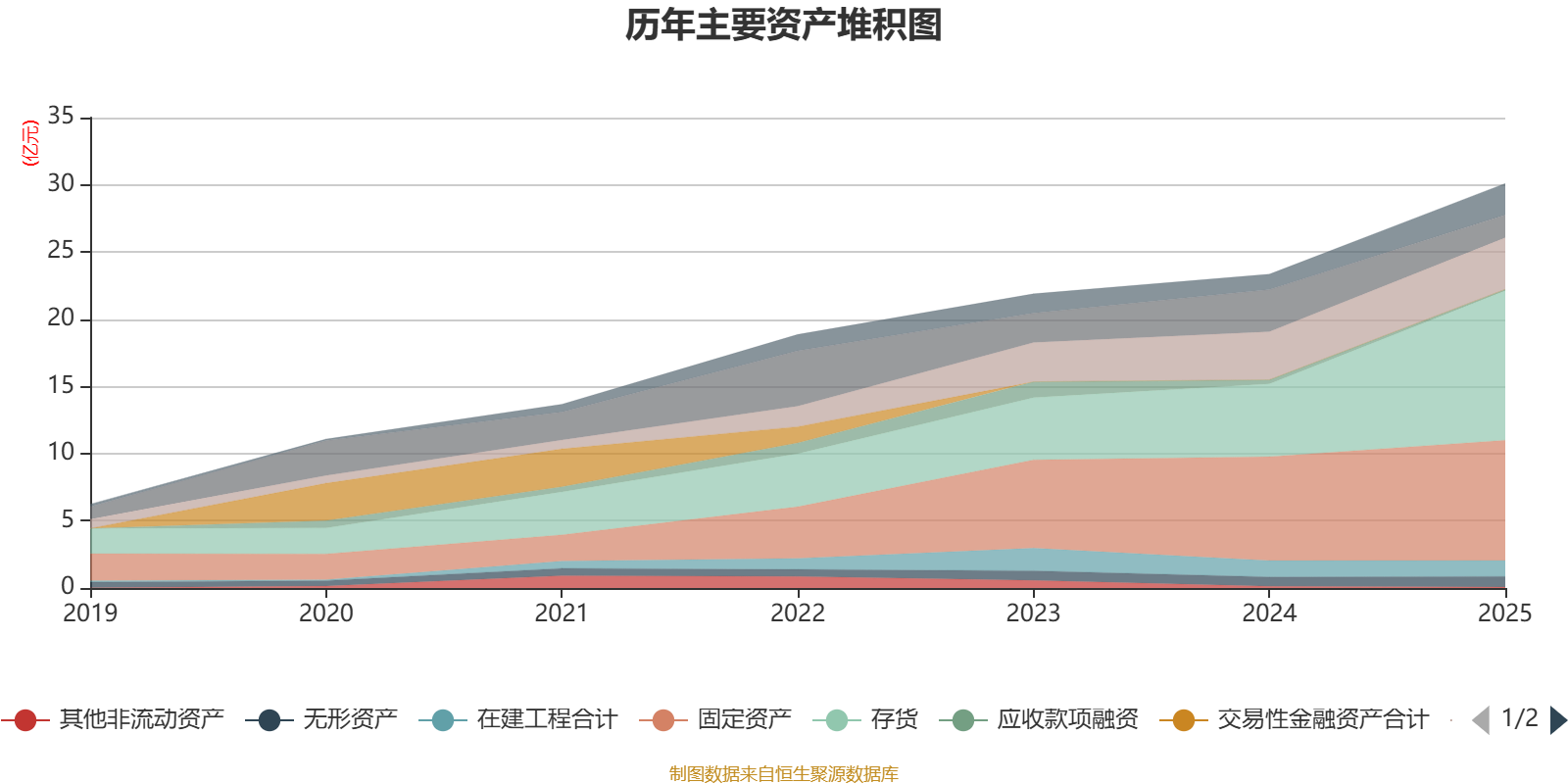 资产重大变化方面,截至2025年末,公司存货较上年末增加105.4%,占公司总资产比重上升13.75个百分点;货币资金较上年末减少45.65%,占公司总资产比重下降7.75个百分点;固定资产较上年末增加15.55%,占公司总资产比重下降3.44个百分点;应收票据及应收账款较上年末增加7.26%,占公司总资产比重下降2.58个百分点。