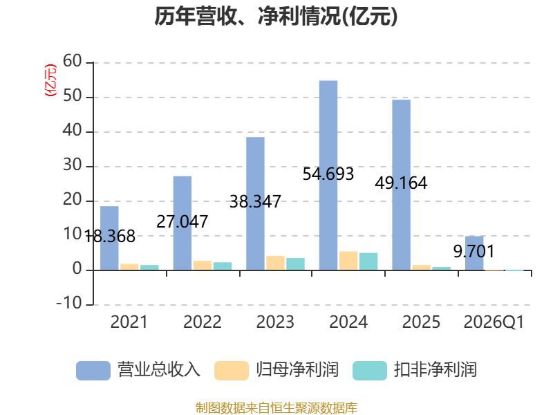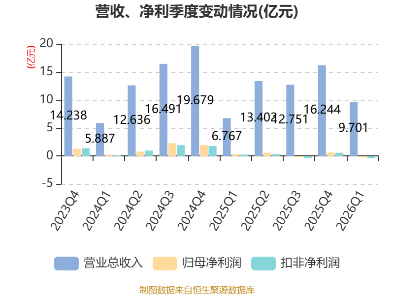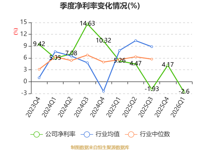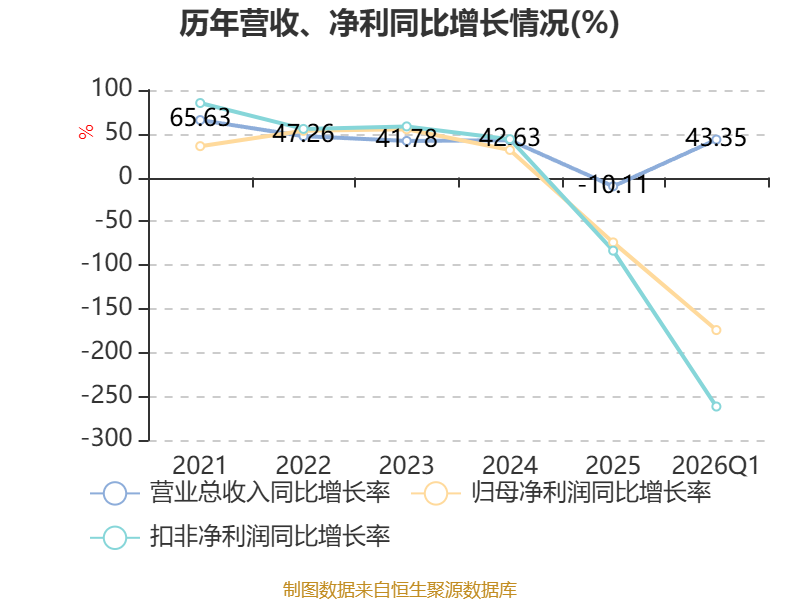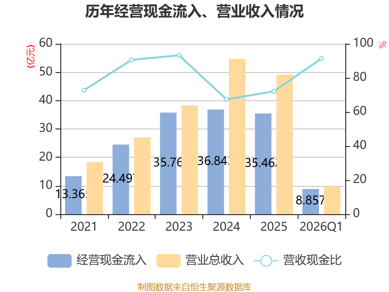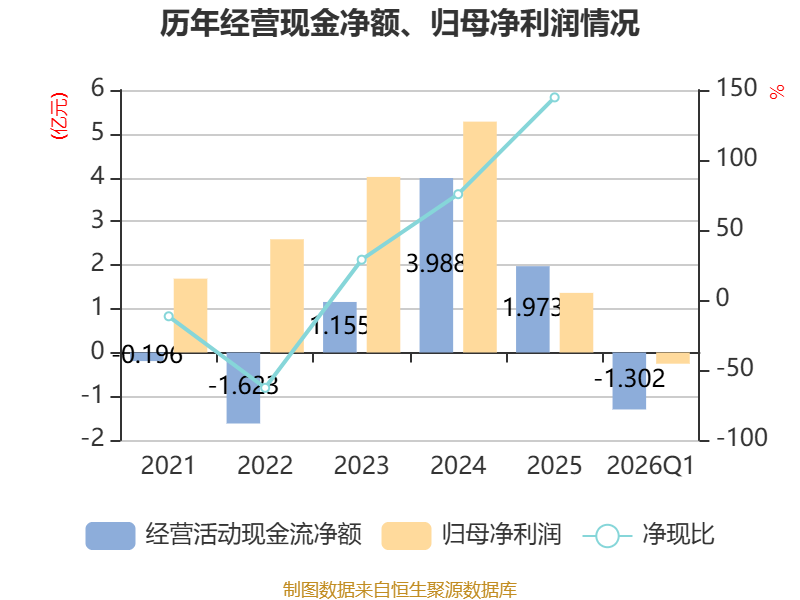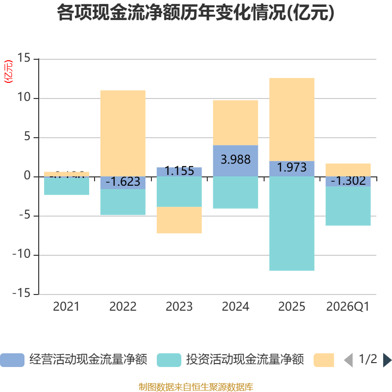 截至2026年一季度末,公司经营活动现金流净额为-1.3亿元,同比减少3141.63万元;筹资活动现金流净额1.65亿元,同比减少10.83亿元;投资活动现金流净额-4.97亿元,上年同期为-2.31亿元。