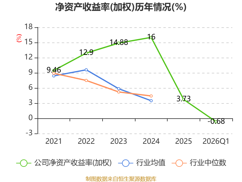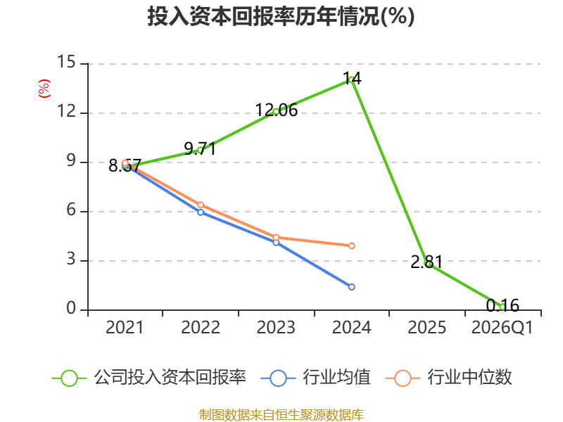 盈利能力方面, 2026年一季度公司加权平均净资产收益率为-0.68%,同比下降1.66个百分点。公司2026年第一季度投入资本回报率为0.16%,较上年同期下降0.59个百分点。