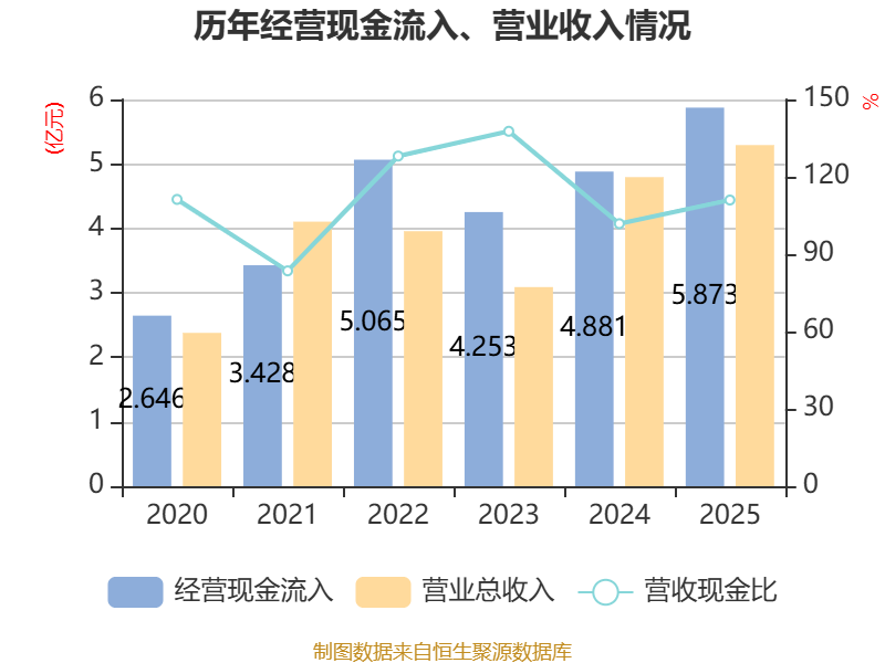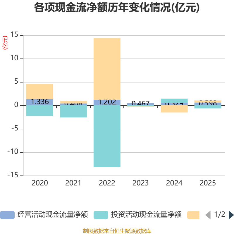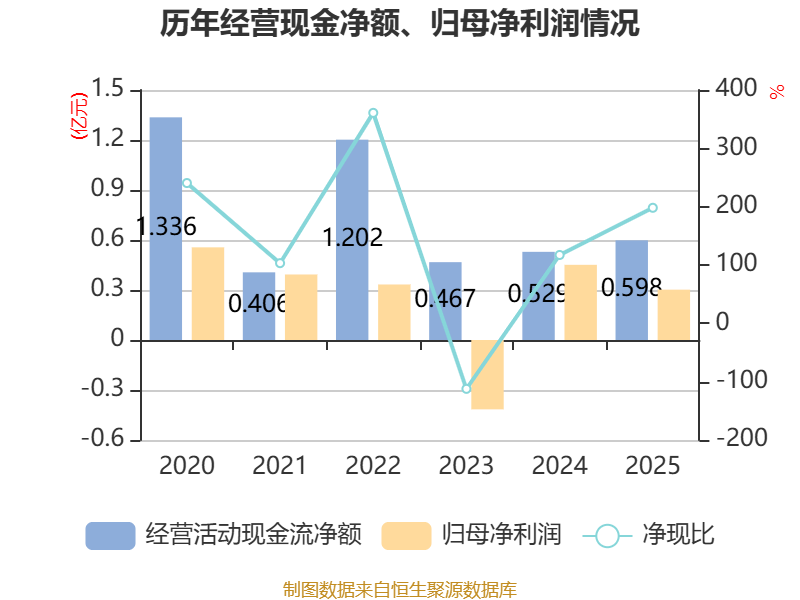 截至2025年,公司经营活动现金流净额为5984.17万元,同比增长13.22%;筹资活动现金流净额4399.81万元,同比增加1.98亿元;投资活动现金流净额-6558.87万元,上年同期为8981.03万元。