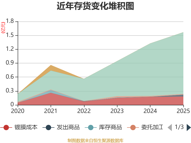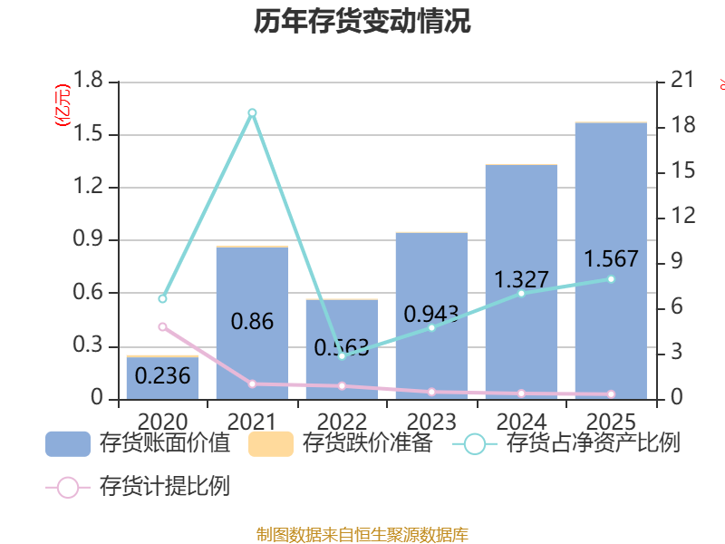 从存货变动来看,截至2025年末,公司存货账面价值为1.57亿元,占净资产的7.93%,较上年末增加2398.49万元。其中,存货跌价准备为48.11万元,计提比例为0.31%。