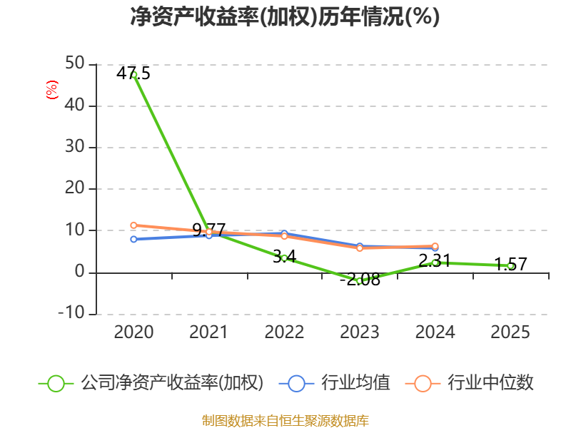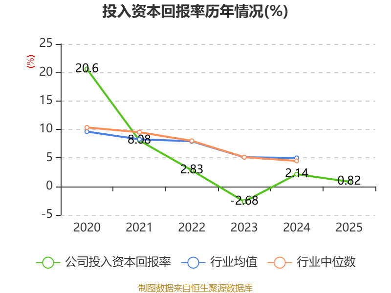 数据显示,2025年公司加权平均净资产收益率为1.57%,较上年同期下降0.74个百分点。公司2025年投入资本回报率为0.82%,较上年同期下降1.32个百分点。