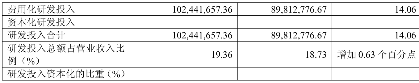 2025年全年,公司研发投入金额为1.02亿元,同比增长14.06%;研发投入占营业收入比例为19.36%,相比上年同期上升0.63个百分点。