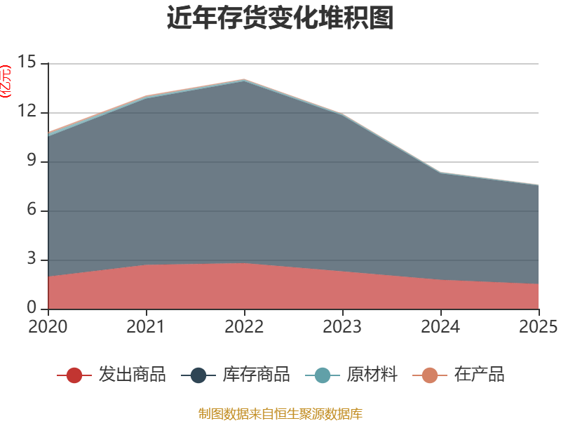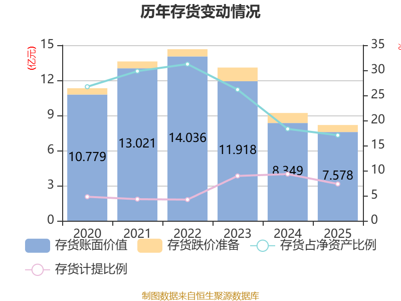 从存货变动来看,截至2025年末,公司存货账面价值为7.58亿元,占净资产的17.04%,较上年末减少7704.59万元。其中,存货跌价准备为5997.92万元,计提比例为7.33%。