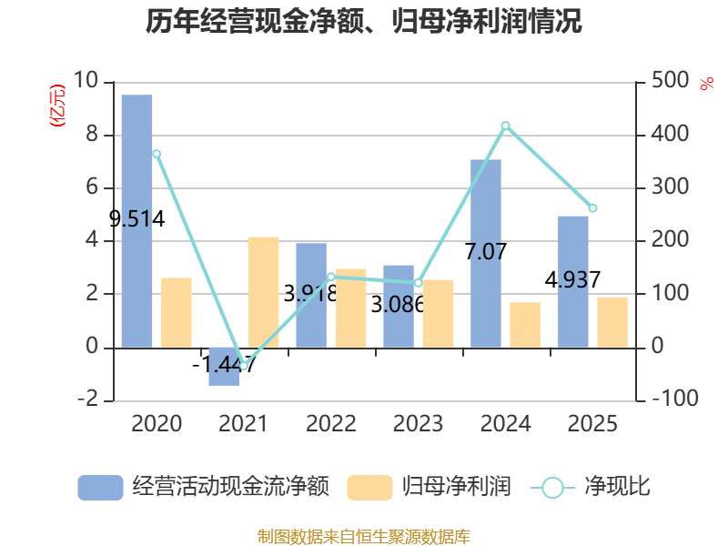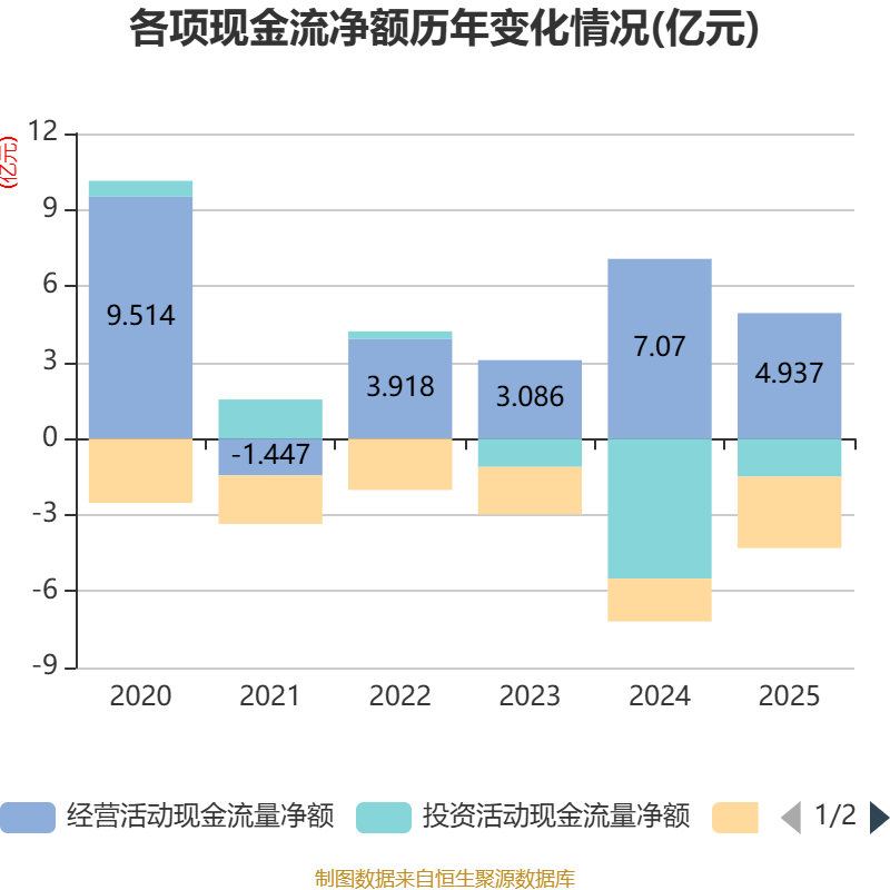 截至2025年,公司经营活动现金流净额为4.94亿元,同比下降30.17%;筹资活动现金流净额-2.81亿元,同比减少1.12亿元;投资活动现金流净额-1.5亿元,上年同期为-5.5亿元。