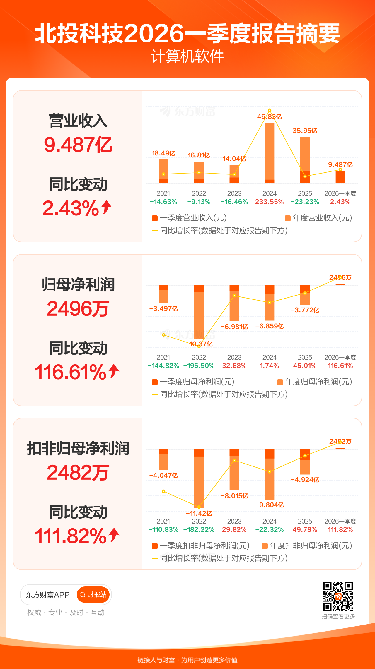 北投科技4月18日发布2026年一季报显示,公司一季度实现营业收入9.49亿元,同比增长2.43%;归母净利润2496.24万元,同比增长116.61%;扣非归母净利润2481.92万元,同比增长111.82%。