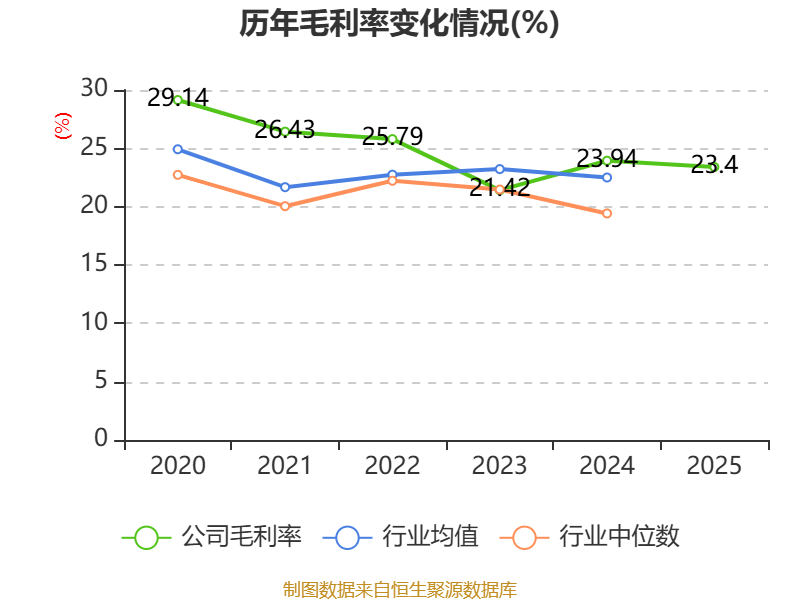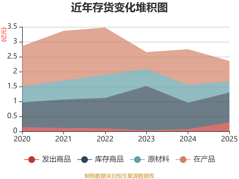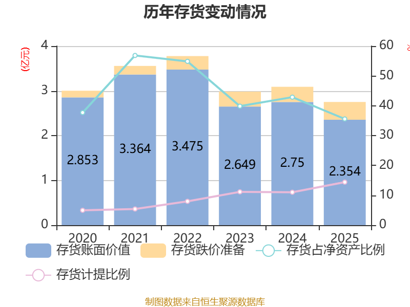 从存货变动来看,截至2025年末,公司存货账面价值为2.35亿元,占净资产的35.57%,较上年末减少3959.19万元。其中,存货跌价准备为3965.42万元,计提比例为14.41%。