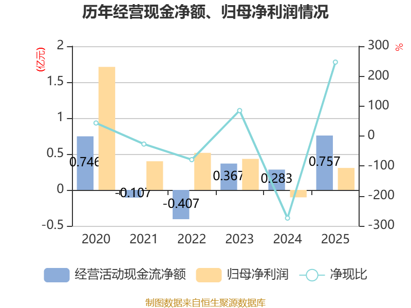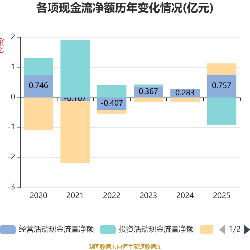 截至2025年,公司经营活动现金流净额为7566.21万元,同比增长167.34%;筹资活动现金流净额3783.55万元,同比增加5194.75万元;投资活动现金流净额-9165.7万元,上年同期为1.86万元。