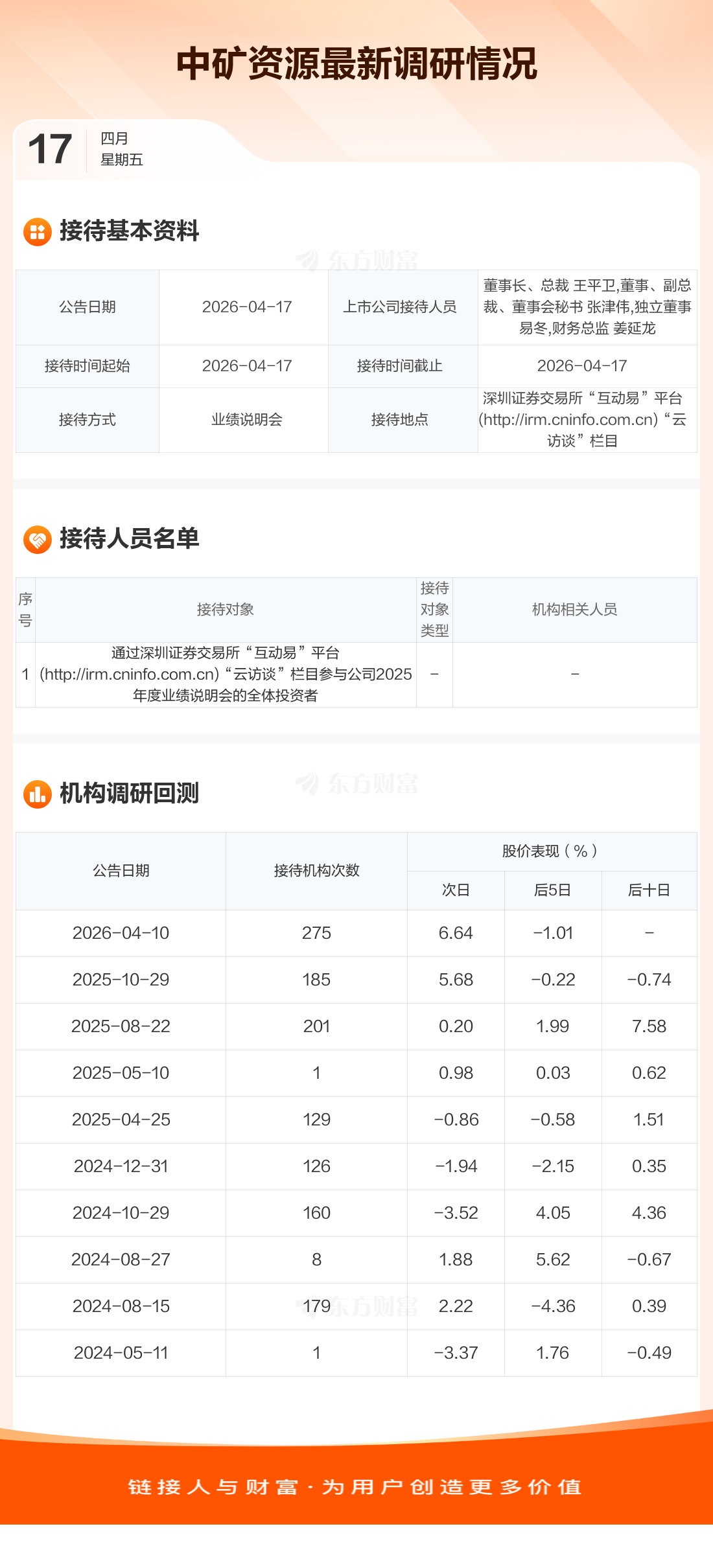 中矿资源4月17日公告称,4月17日接待通过深圳证券交易所“互动易”平台(http://irm.cninfo.com.cn)“云访谈”栏目参与公司2025年度业绩说明会的全体投资者调研。接待人员包括董事长、总裁 王平卫,董事、副总裁、董事会秘书 张津伟,独立董事 易冬,财务总监 姜延龙。