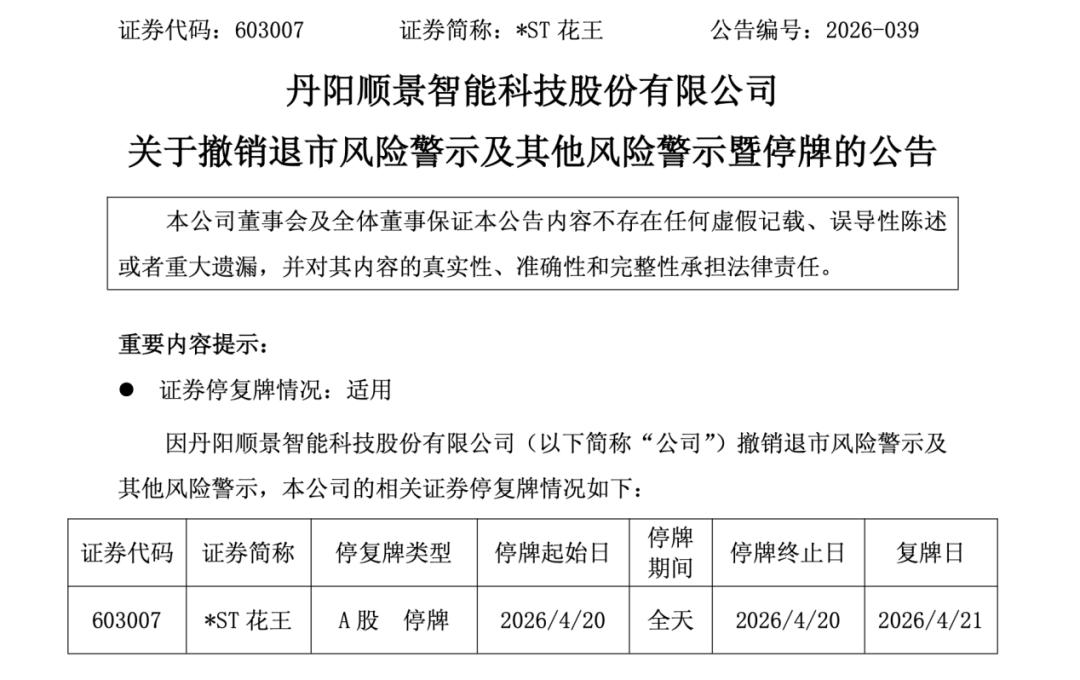 4月17日,*ST花王发布公告称,公司收到上海证券交易所通知,同意撤销对公司股票实施的退市风险警示及其他风险警示。公司股票将于4月20日停牌一天,4月21日起复牌并撤销相关风险警示。