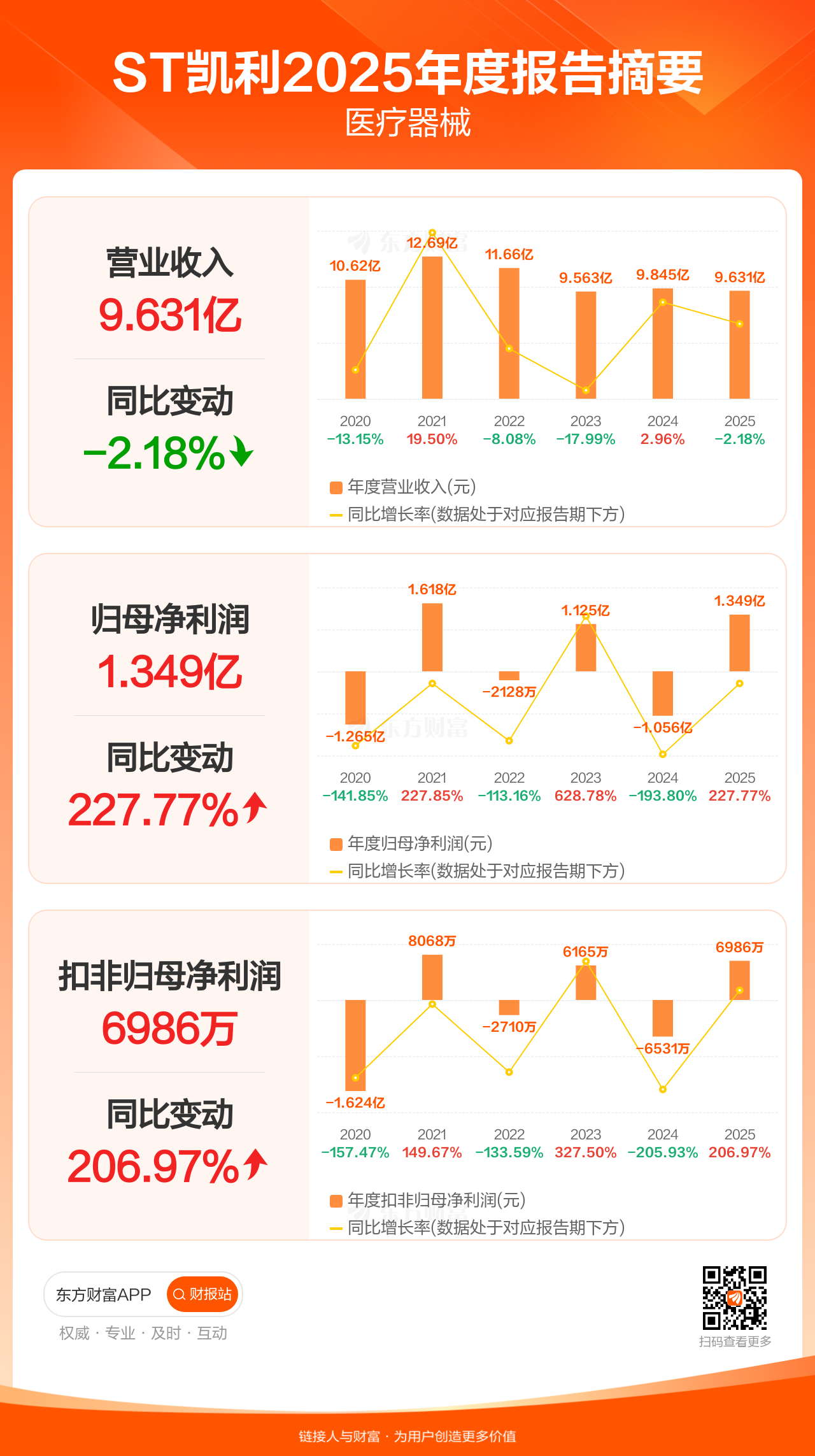 ST凯利4月18日发布2025年年报显示,公司全年实现营业收入9.63亿元,同比下滑2.18%;归母净利润1.35亿元,同比增长227.77%;扣非归母净利润6985.52万元,同比增长206.97%。