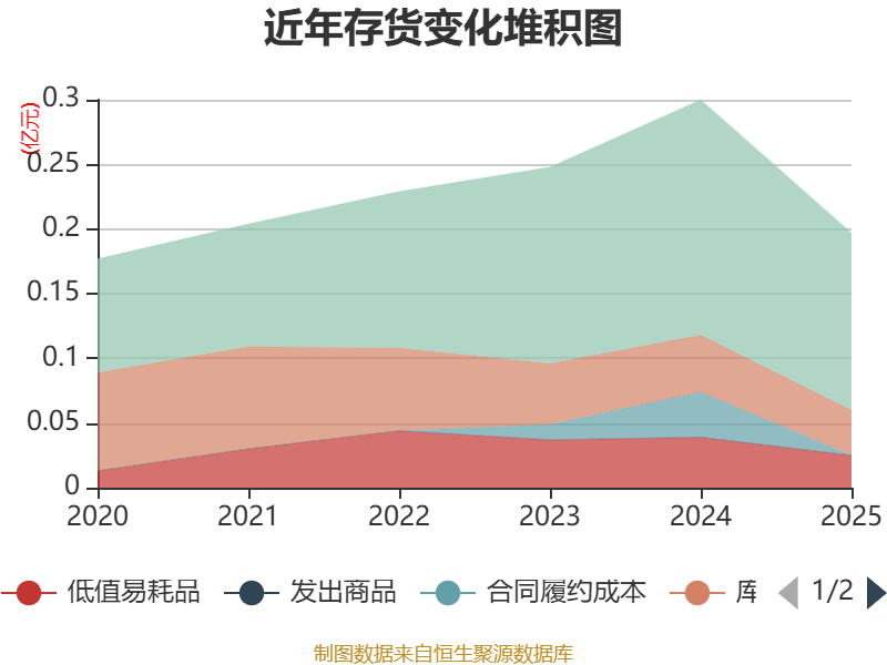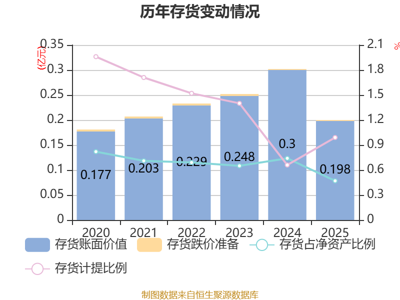 从存货变动来看,截至2025年末,公司存货账面价值为1976.94万元,占净资产的0.47%,较上年末减少1021.96万元。其中,存货跌价准备为19.85万元,计提比例为0.99%。
