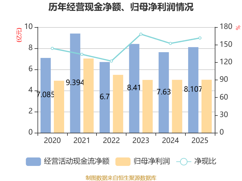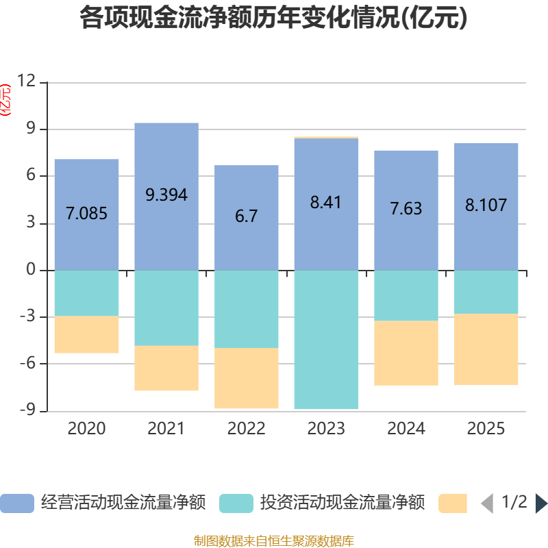 截至2025年,公司经营活动现金流净额为8.11亿元,同比增长6.26%;筹资活动现金流净额-4.55亿元,同比减少4274.2万元;投资活动现金流净额-2.79亿元,上年同期为-3.25亿元。