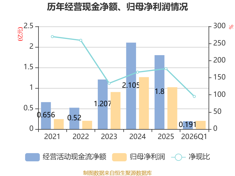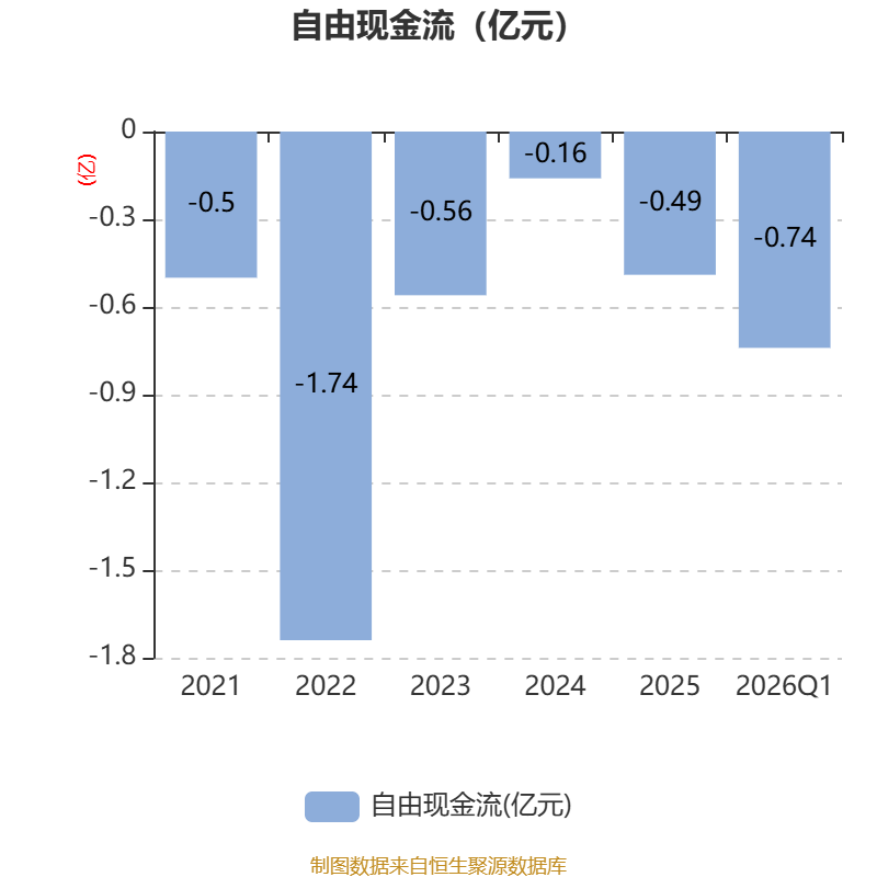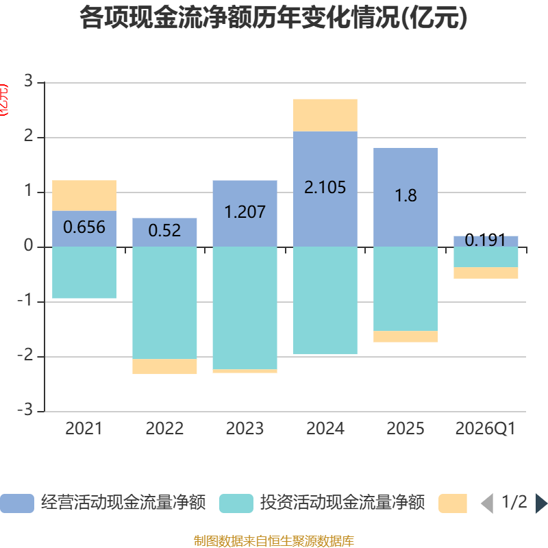 截至2026年一季度末,公司经营活动现金流净额为1909.82万元,同比下降68.55%;筹资活动现金流净额-2079.53万元,同比减少3560.9万元;投资活动现金流净额-3773.37万元,上年同期为-4081.36万元。