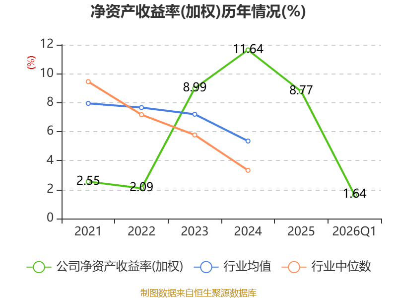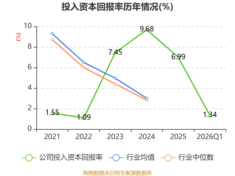 盈利能力方面, 2026年一季度公司加权平均净资产收益率为1.64%,同比下降0.99个百分点。公司2026年第一季度投入资本回报率为1.34%,较上年同期下降0.8个百分点。