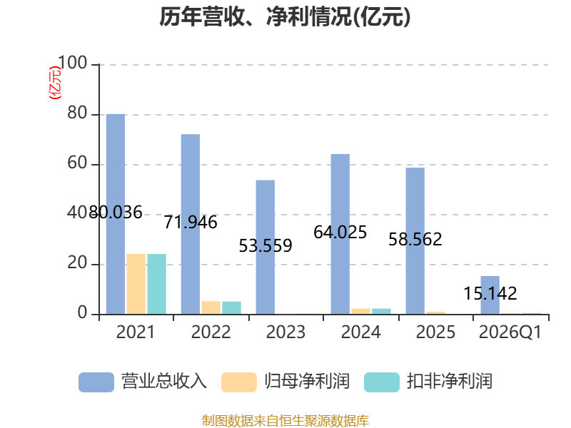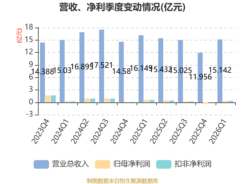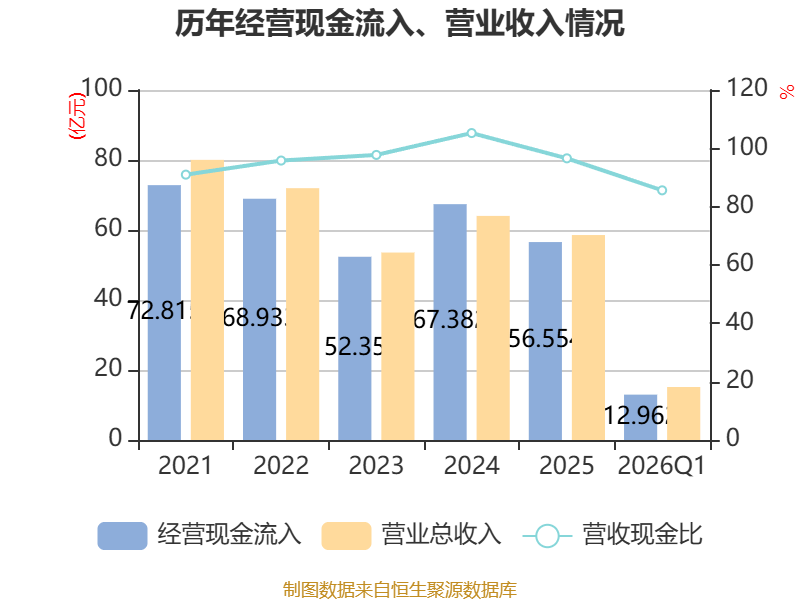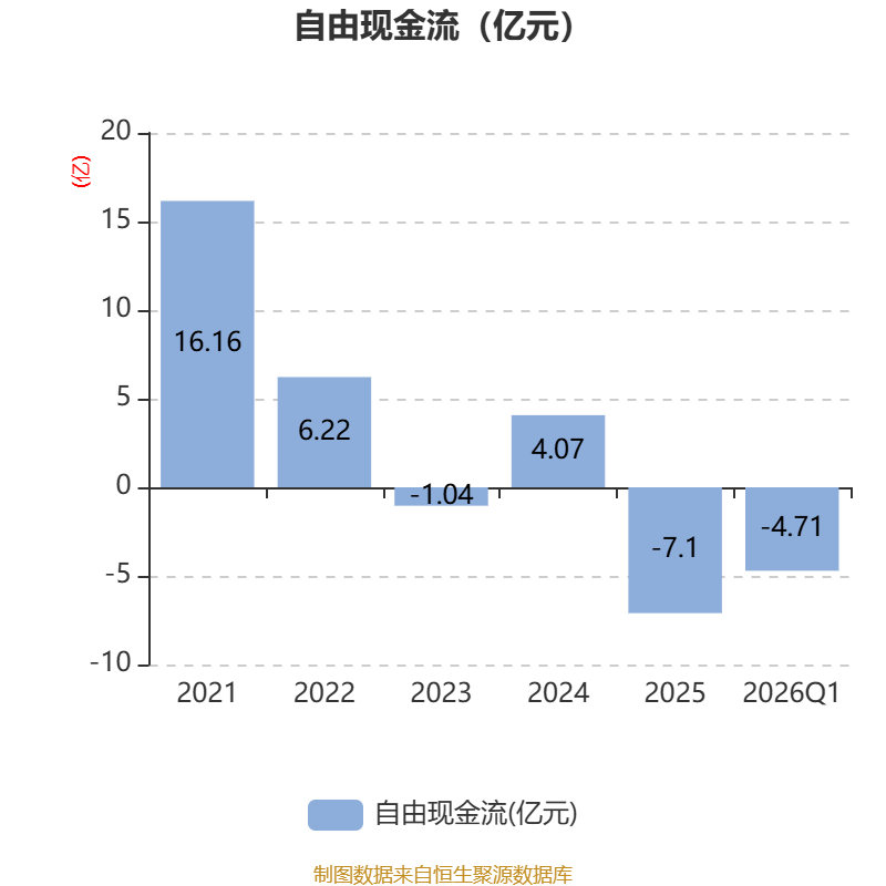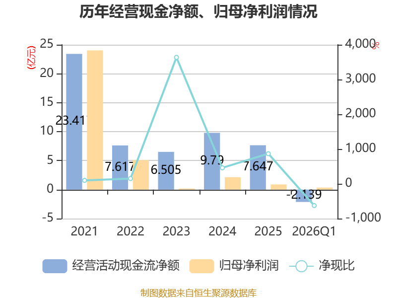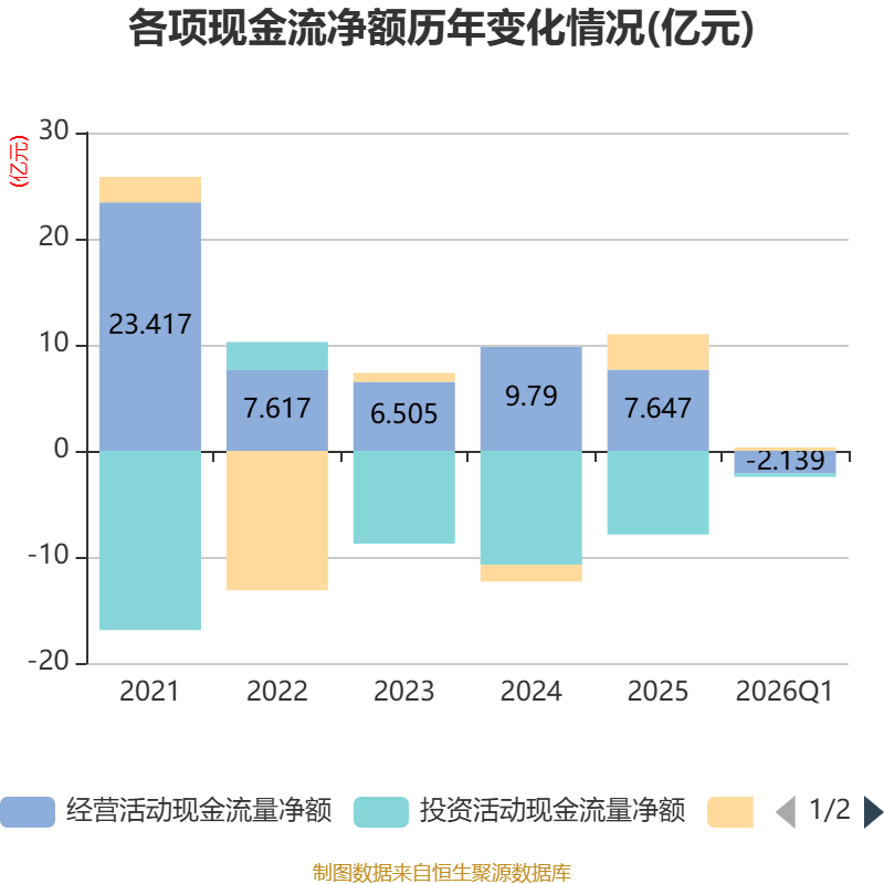 截至2026年一季度末,公司经营活动现金流净额为-2.14亿元,同比减少1.87亿元;筹资活动现金流净额3198.11万元,同比增加1.69亿元;投资活动现金流净额-3122.51万元,上年同期为2049.01万元。