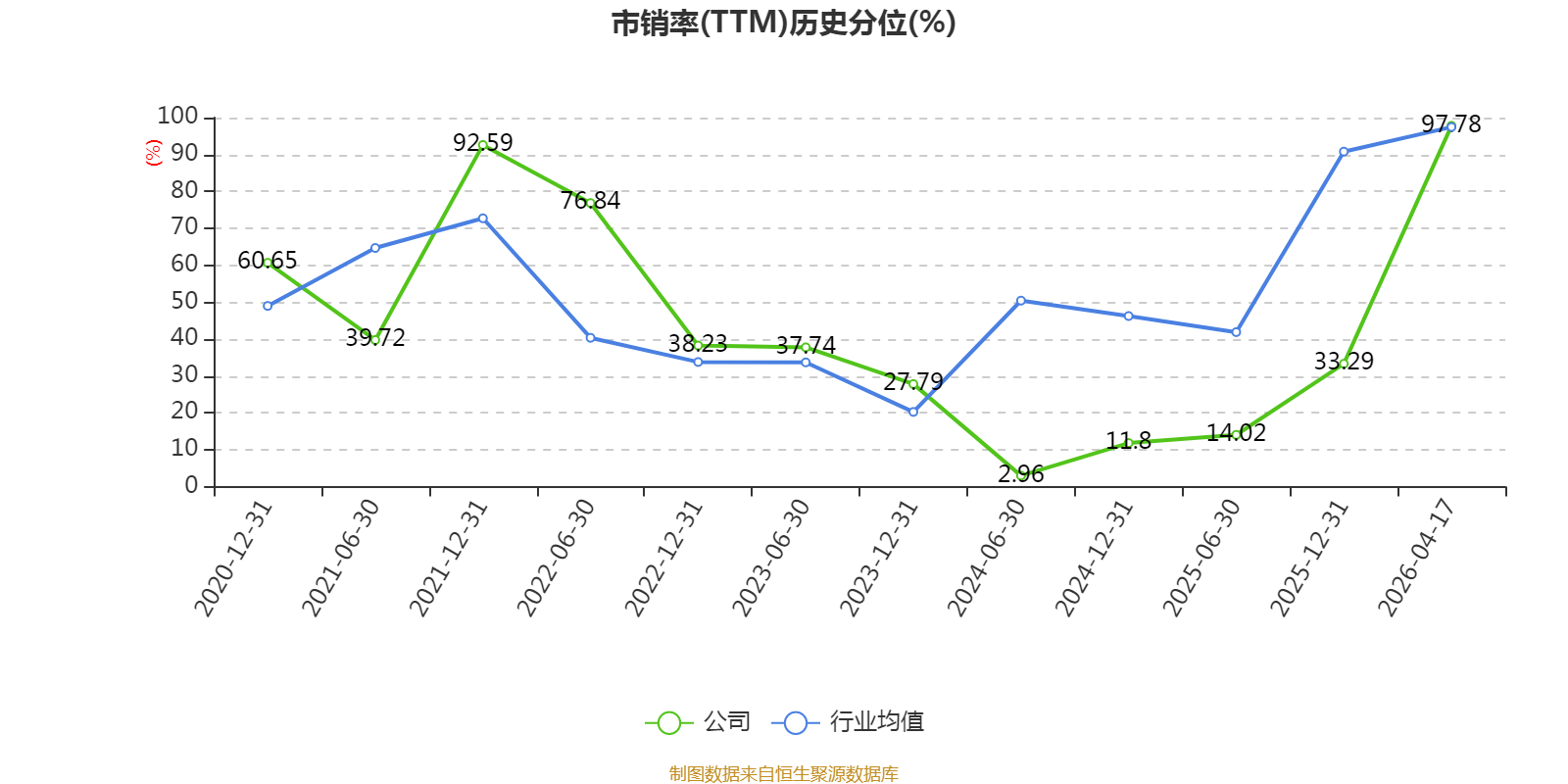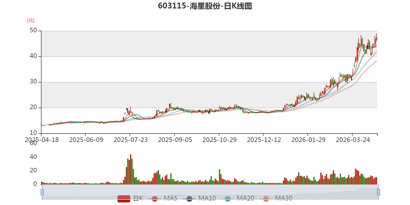 以4月17日收盘价计算,海星股份目前市盈率(TTM)约为51.28倍,市净率(LF)约5.29倍,市销率(TTM)约4.73倍。